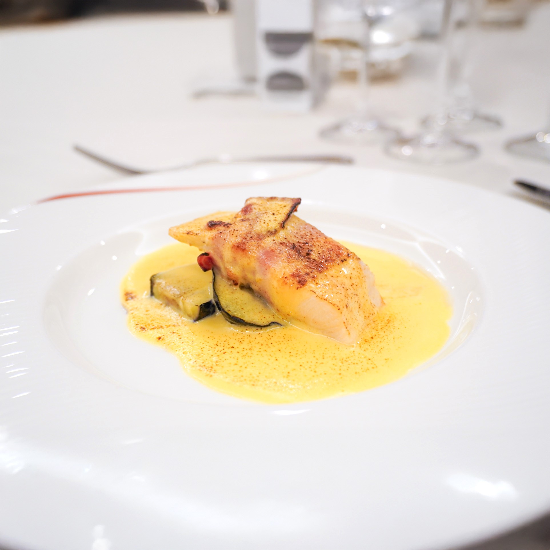 富士山の湧き水と森の環境で育まれた白い身が特徴の「ホワイト富士山サーモン」は、川魚本来の美しさと、優しい甘さをもった上品な味わいで、すっきりとした脂のり、きゅっと締まった瑞々しさが魅力といわれます。黒田は、この「ホワイト富士山サーモン」を秋茄子とともにグラチネ風に仕上げご提供します。また、白ワインベースのクリームソースは、濃厚さを引き立てながらもやわらかい酸味ですっきりと仕立てており、グラチネのこんがりとした香りをお楽しみいただけます。