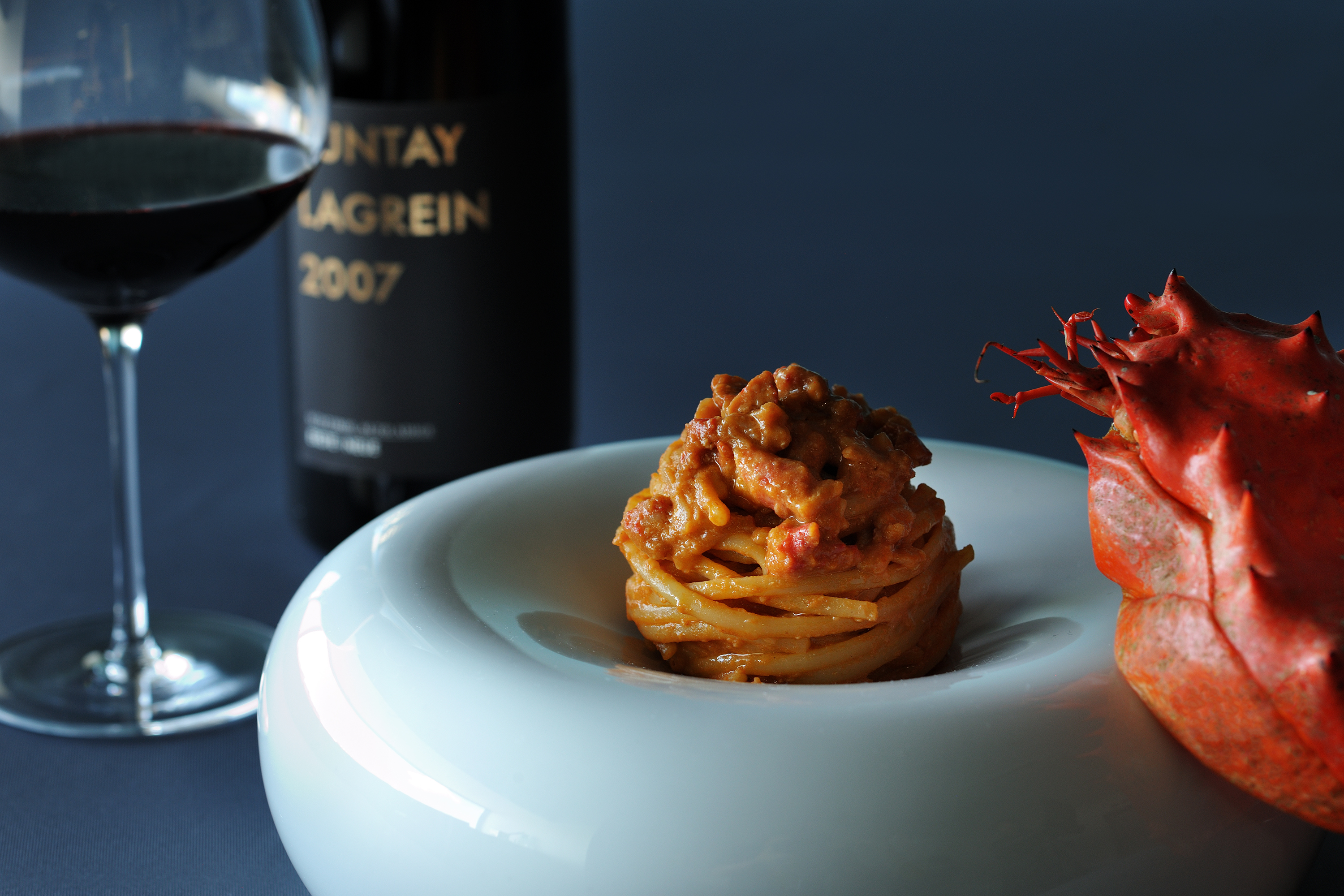 パスタには、バルサミコを思わせる熟成のニュアンスと円みのあるタンニンが特徴の「ラグレイン2007」を合わせます。この熟成感が甲殻類とトマトを凝縮したソースと合うことで、料理の味わいをより深く引き立てるペアリングです。