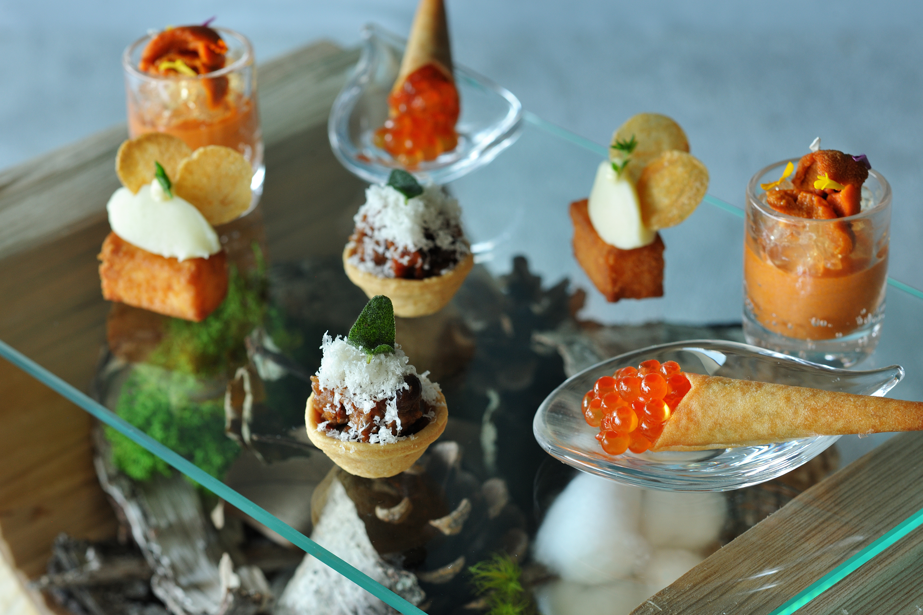 コースの始まりを彩る小前菜は、海と大地からの恵みを凝縮した華やかな4種類の料理です。コルノは、爽やかなレモンや香草の香りを合わせたサーモンのパテを詰め、イクラをふんだんに盛りつけました。パッパコルポモドーロ(*2)は、クリアなトマトジュレの上に、濃厚な雲丹を添えました。澄んだトマトの酸味と、雲丹の甘くまろやかな風味が絶妙なハーモニーを生み出します。これらの料理は、北海道を代表する白樺の木でできた器の上に並べられます。肉や魚、野菜などさまざまな食材を使用している前菜を、白樺の器の風合いが北海道の広大な大地を思わせる豊かさで包み込みます。