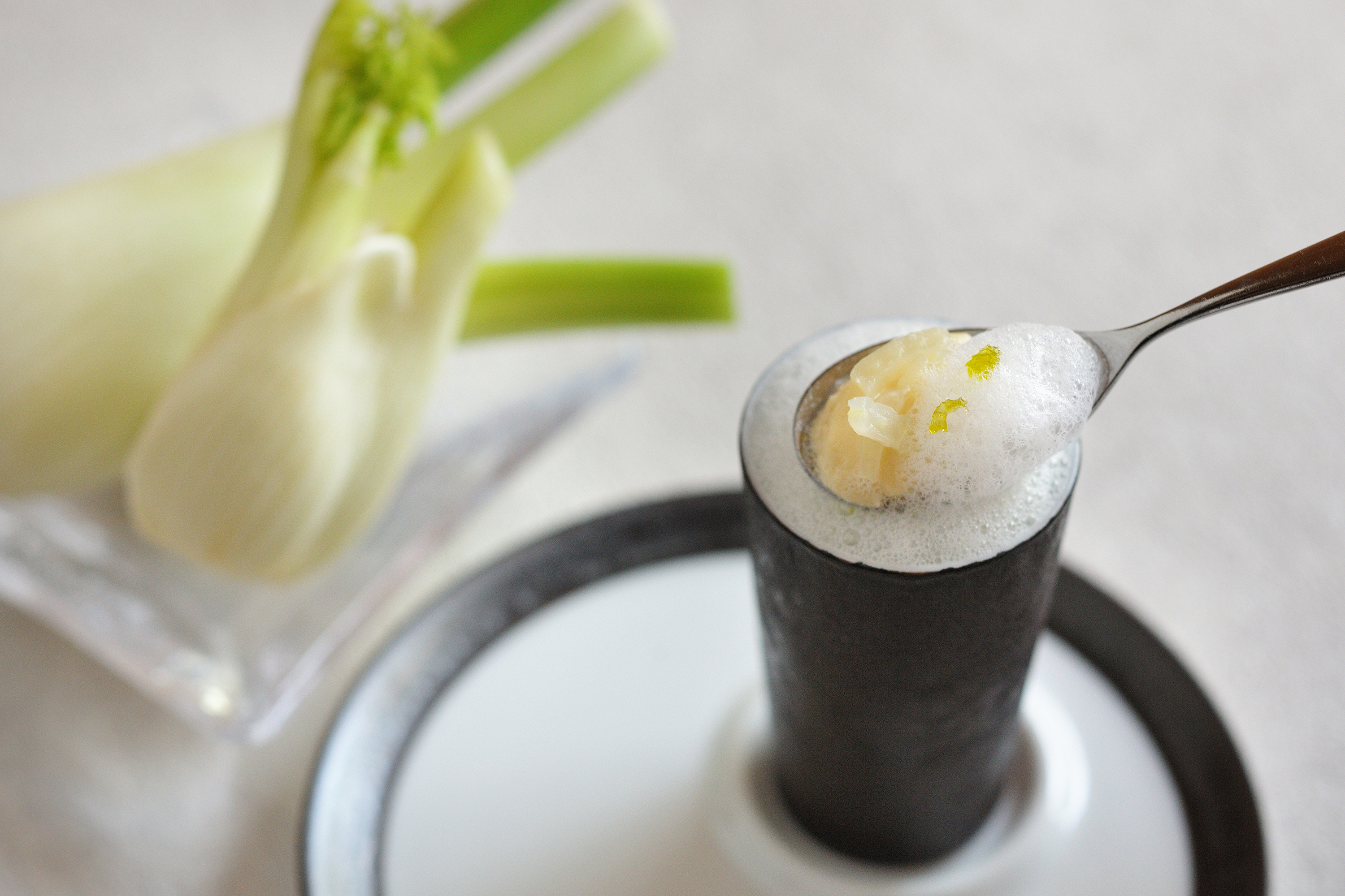爽やかな香りが特徴のフィノッキオ(*1)をスフォルマート(*2)にし、生ハムの風味を移したミルクフォームと合わせました。仕上げのオイルには、フィノッキオの葉の香りを抽出しています。フィノッキオの爽やかな味わいを楽しめる一皿です。