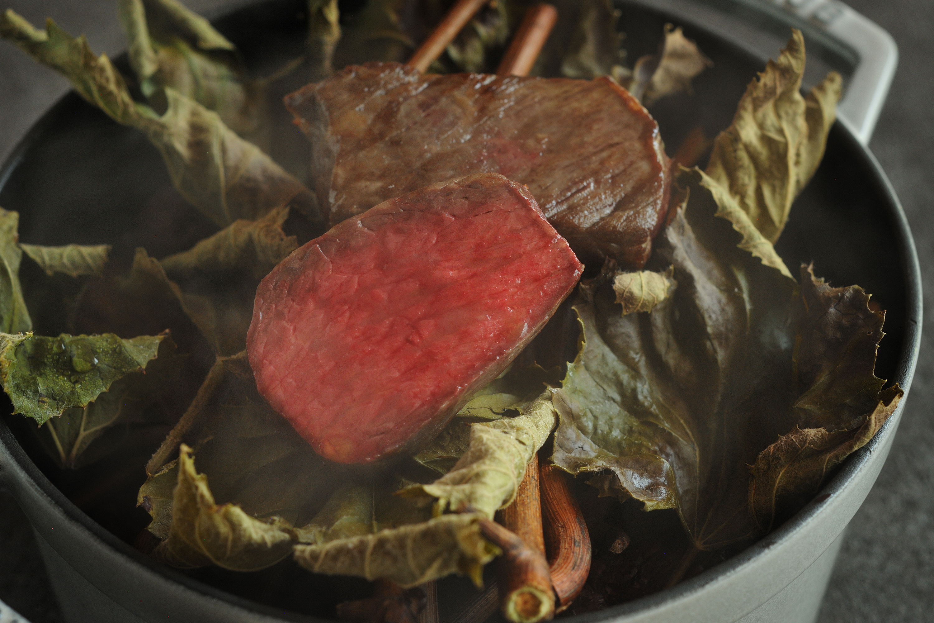 葡萄の搾り粕を食べて育った牛肉に、葡萄の枝や葉の薫香を纏わせ仕上げることで、より牛肉の旨味を引き立てたグリッリア(*6)です。ポルチーニのグラティナート(*7)と合わせた、この地域ならではのイタリア料理が存分に味わえます。