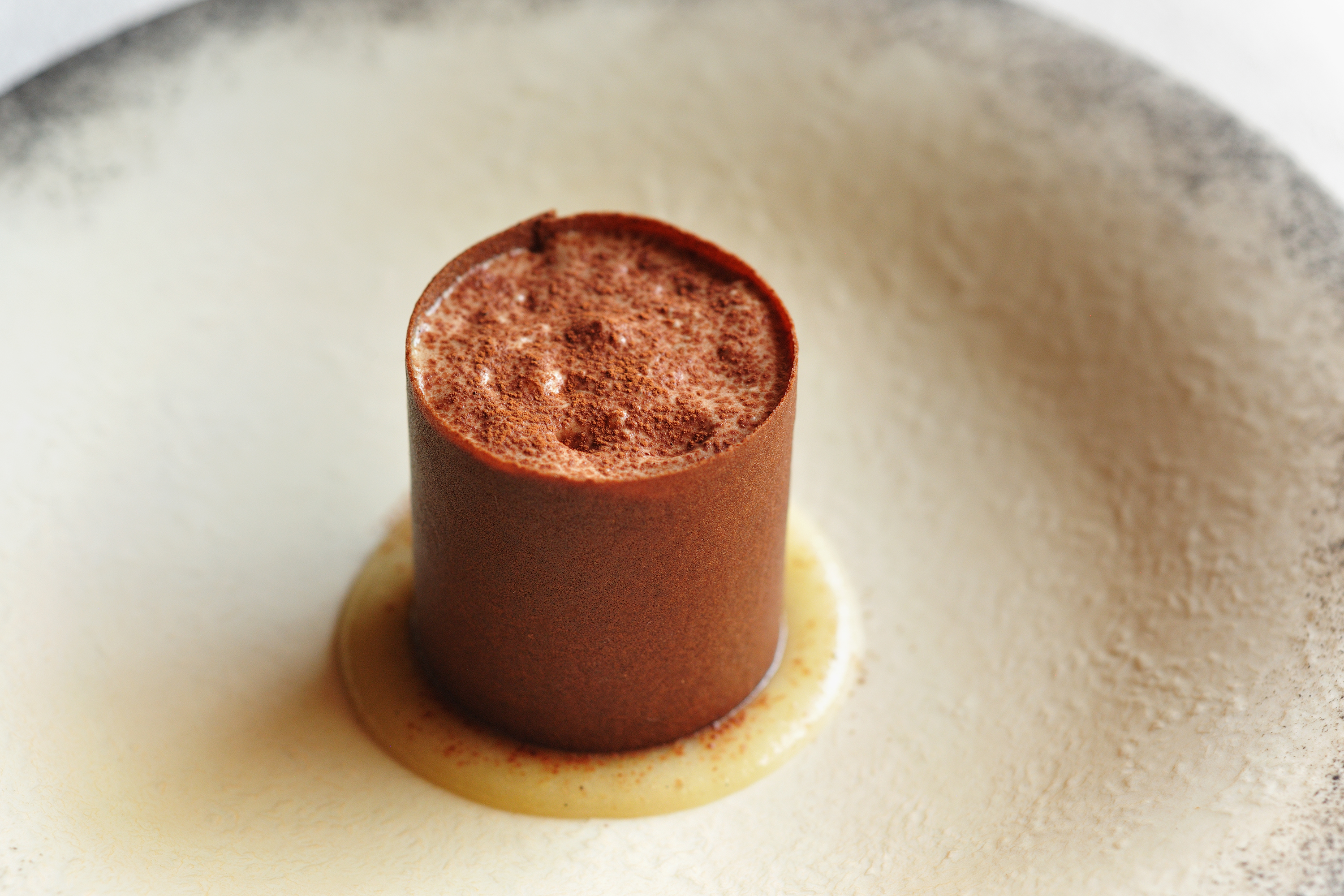 牛蒡の風味がしっかりと残るアイスクリームとエスプーマ、スパイスが香る洋梨のコンポート、食感が心地よいカカオクランブルをカカオのチュイルで包みました。アイスクリームには牛蒡の実を、エスプーマには焼いた牛蒡の皮の風味を落とし込んだ、旬の牛蒡を存分に味わえる冬ならではの一皿です。