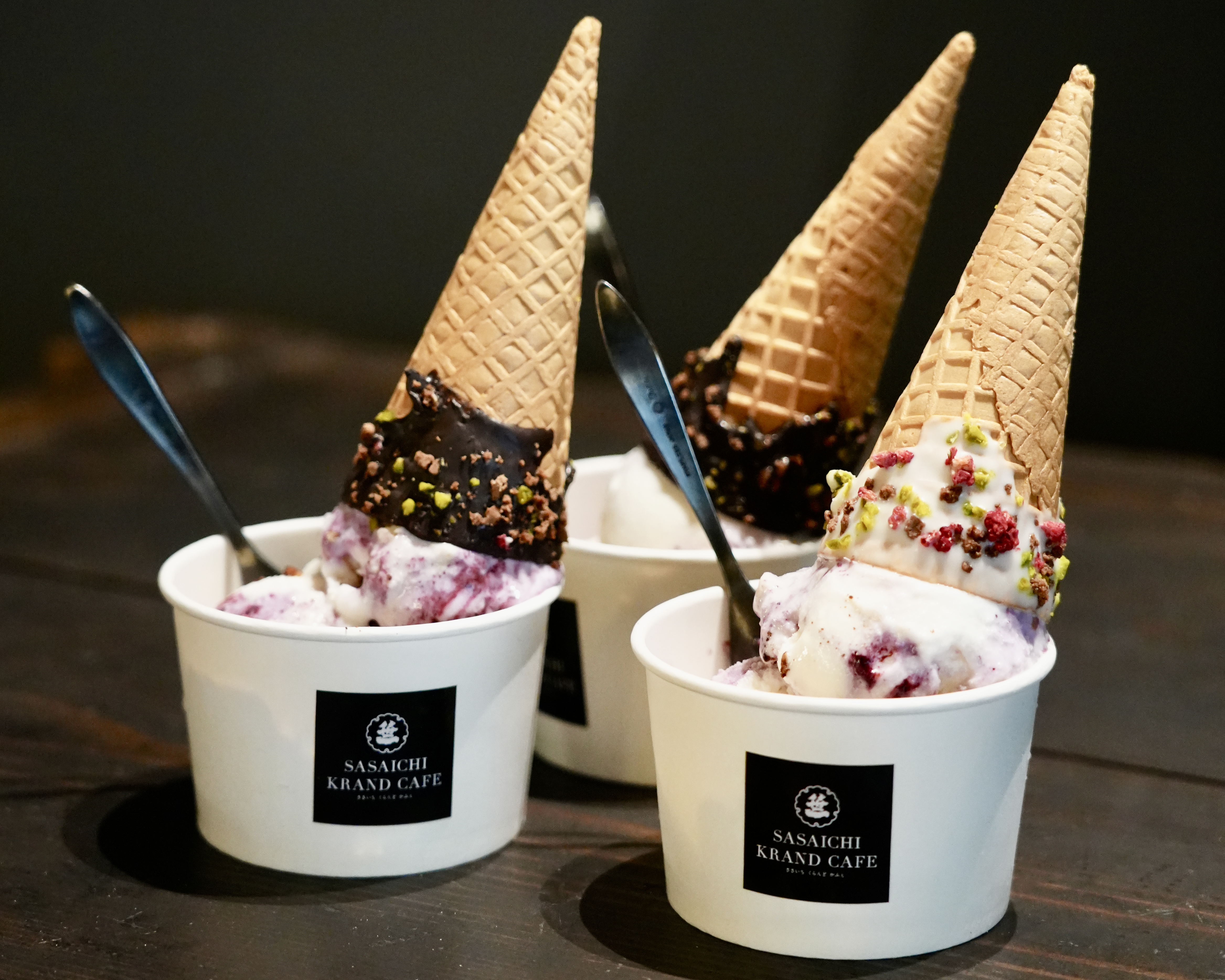 蔵元直営カフェ「SASAICHI KRAND CAFE(ササイチクランドカフェ)」で新酒まつりの両日限定で提供される「笹一酒粕チーズケーキサンデー スペシャル」は、人気の「笹一酒粕チーズケーキ」にカシスを混ぜ込みアイスにした、新酒まつり限定の特別なスイーツです。笹一酒造の酒粕の芳醇な香りとチーズケーキアイスの爽やかな酸味を愉しむ逸品です。ぜひお召し上がりください。