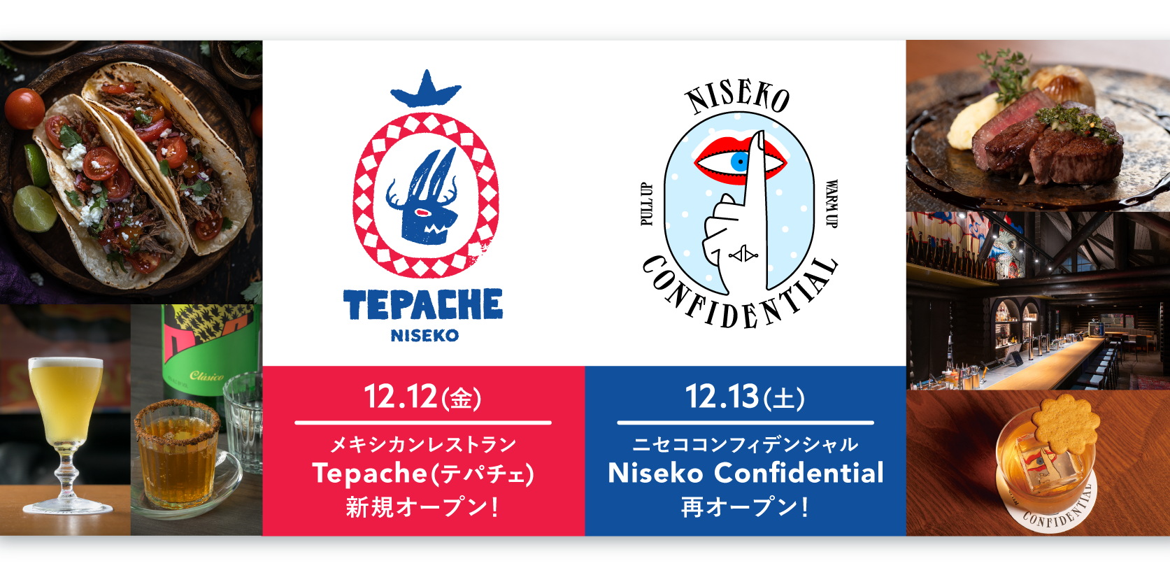 Eat Meグループは今冬ニセコで計3店舗を運営します。北海道最⼤級のアガベスピリッツコレクションと本格的なメキシコ料理、洗練されたカクテルが楽しめるレストランバー「Tepache(テパチェ)」も2025年12月12日(金)新規オープン予定です。テキーラ、メスカル、ライシージャなど北海道最大級のアガベスピリッツコレクションを誇ります。また、昨年オープンし話題を呼んだ「Niseko Confidential(ニセココンフィデンシャル)」も2シーズン目を迎えて2025年12月13日(土)に再オープン。クラフトカクテルと厳選された料理、そして心地よい「ハウスパーティ」スタイルの空間をお楽しみいただけます。