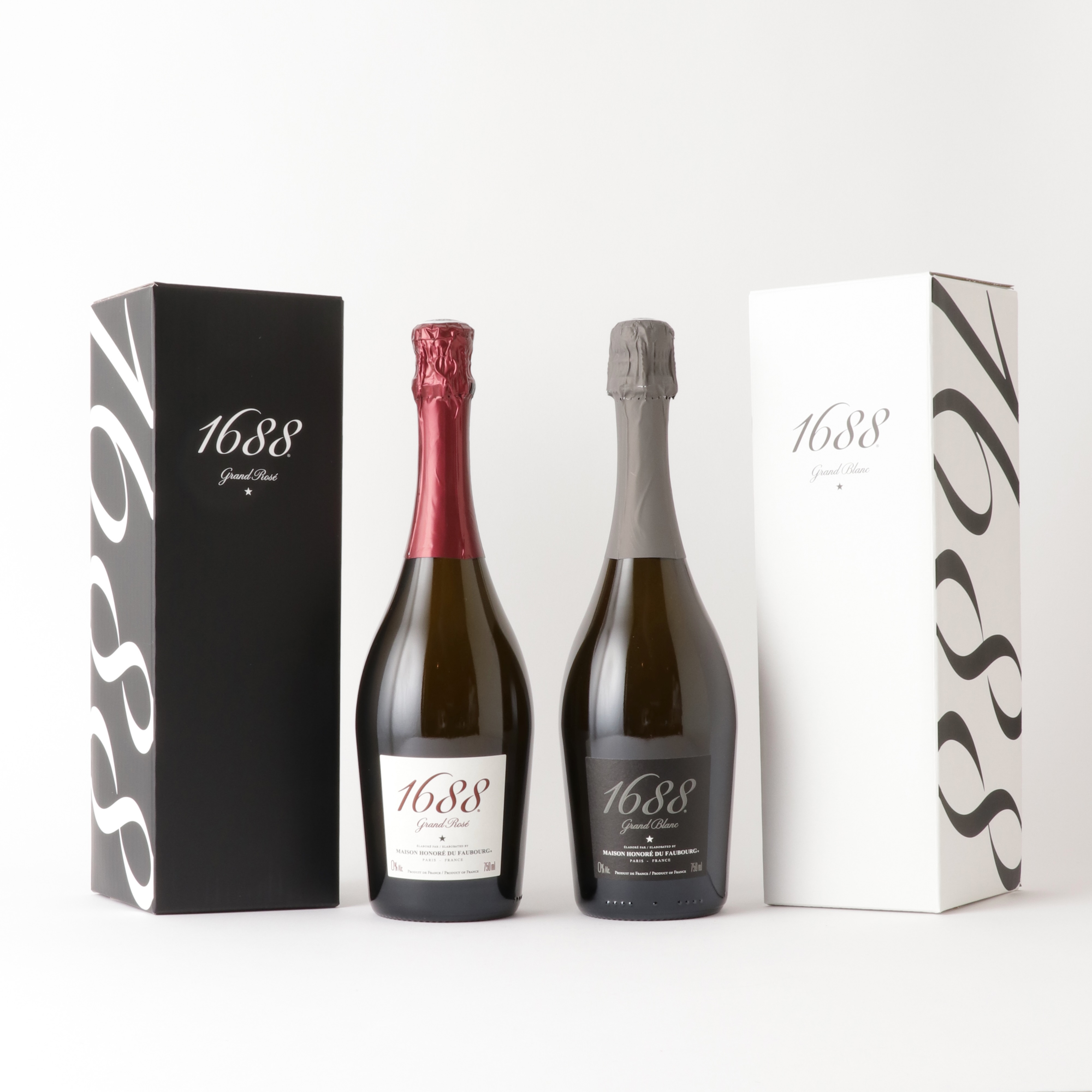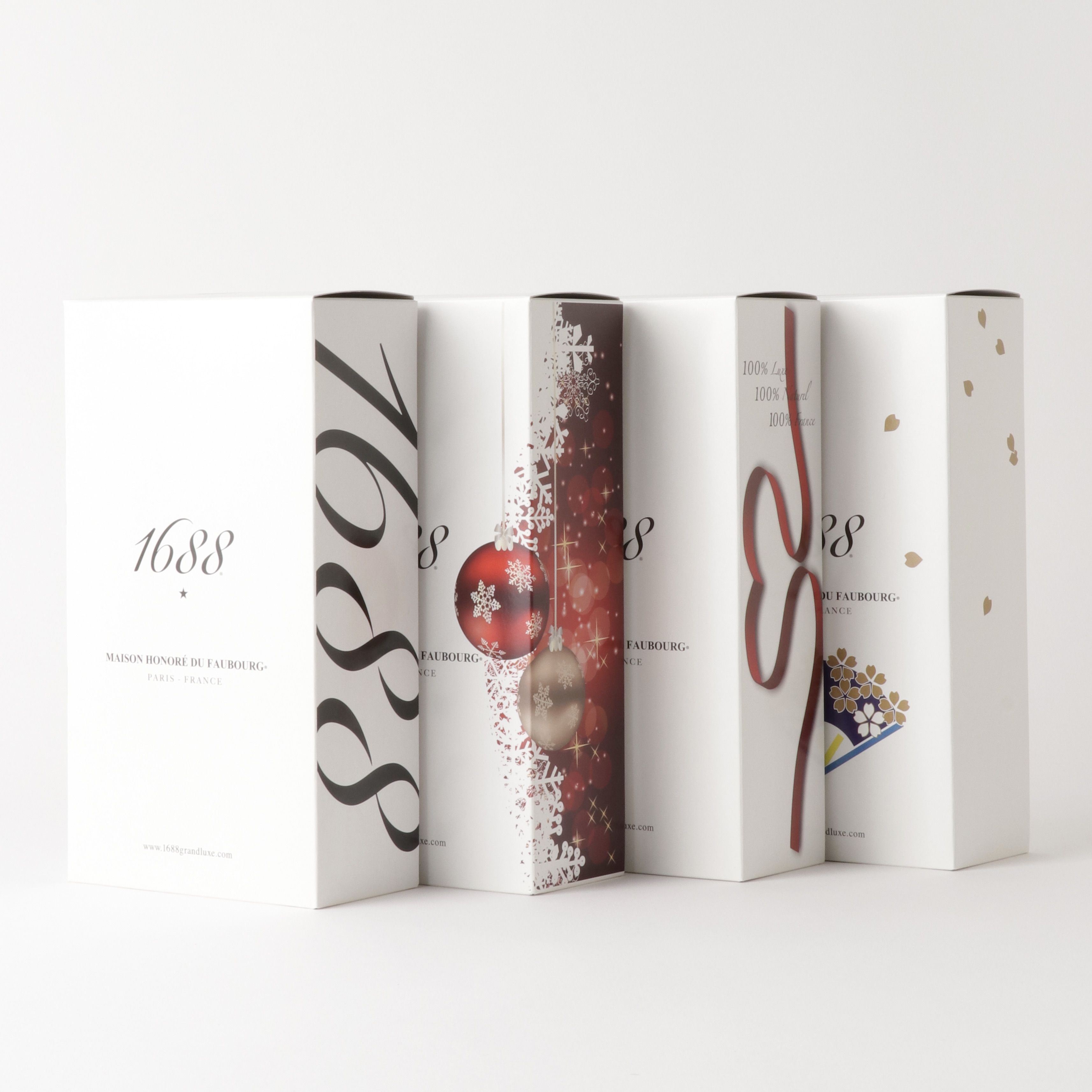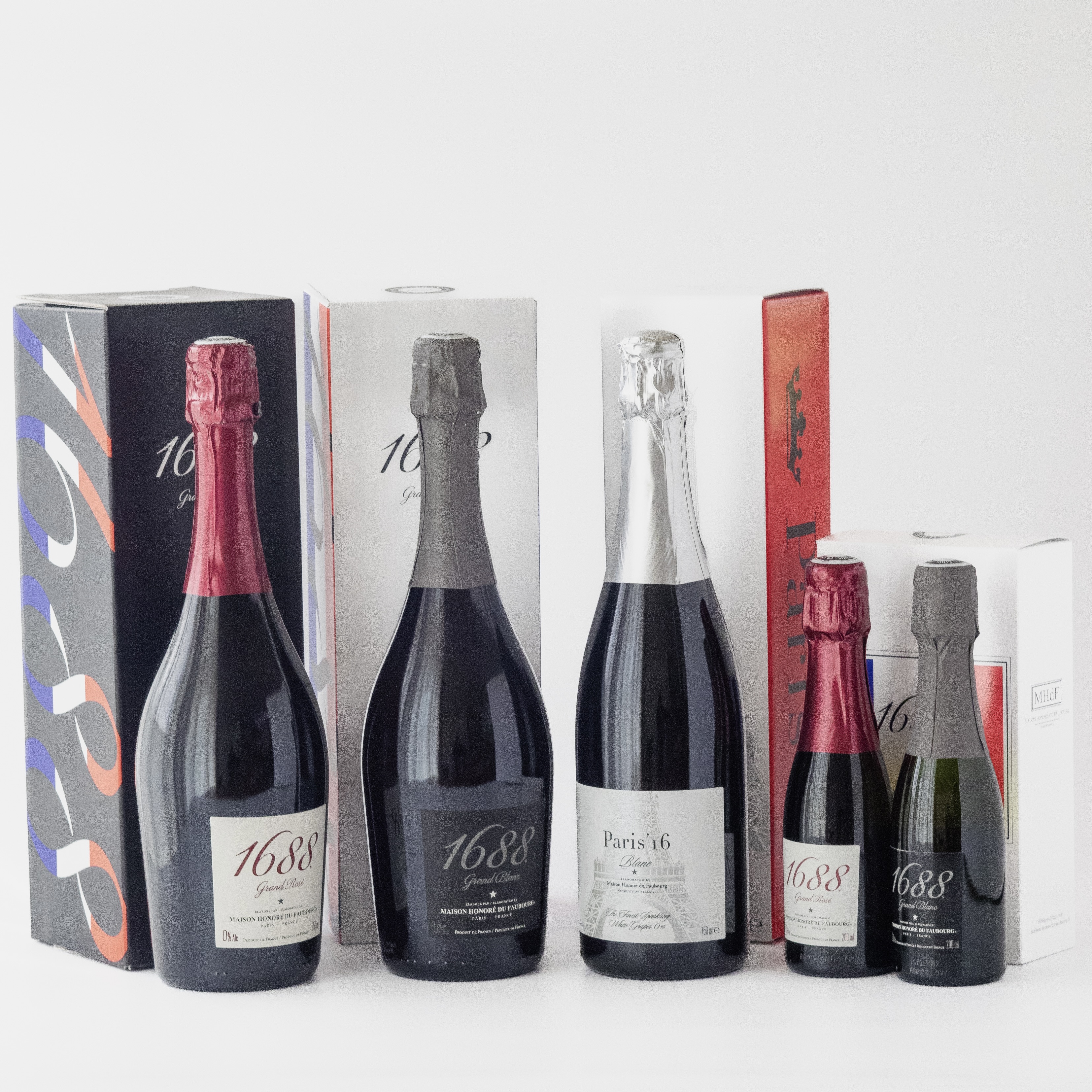 スタンダードの1688とParis’16の750mlの化粧箱は、黒と白が基調。200mlのペアセットは4種類のレパートリーがあります。 その他、2024年新登場のトリコロールBox(写真下)はフランス国旗の青と赤が配色されています。