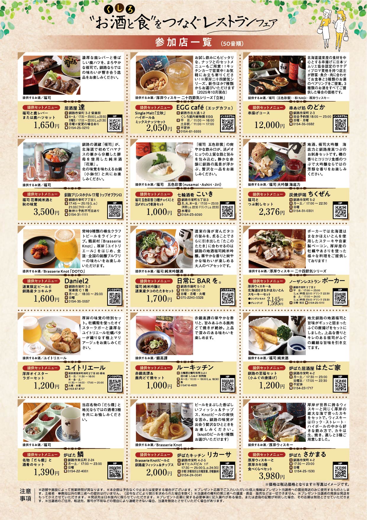 北海道釧路総合振興局では、くしろ地域のお酒を活用した地域振興の機運醸成や管内飲食店でのくしろ地域のお酒の取扱増加等を目的として、管内飲食店でくしろ地域のお酒にあわせたセットメニューの提供を行うフェアを令和7年11月4日から12月7日の約1ヶ月間開催します。