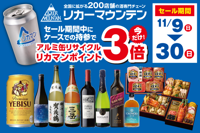 全国に200店舗で酒の専門店をチェーン展開する株式会社リカーマウンテン(本社:京都市)は、11月9日(日)~30日(日)の間、深夜営業店舗などの一部を除く店舗で「アルミ缶リサイクル リカマンポイント3倍セール」を開催いたします。