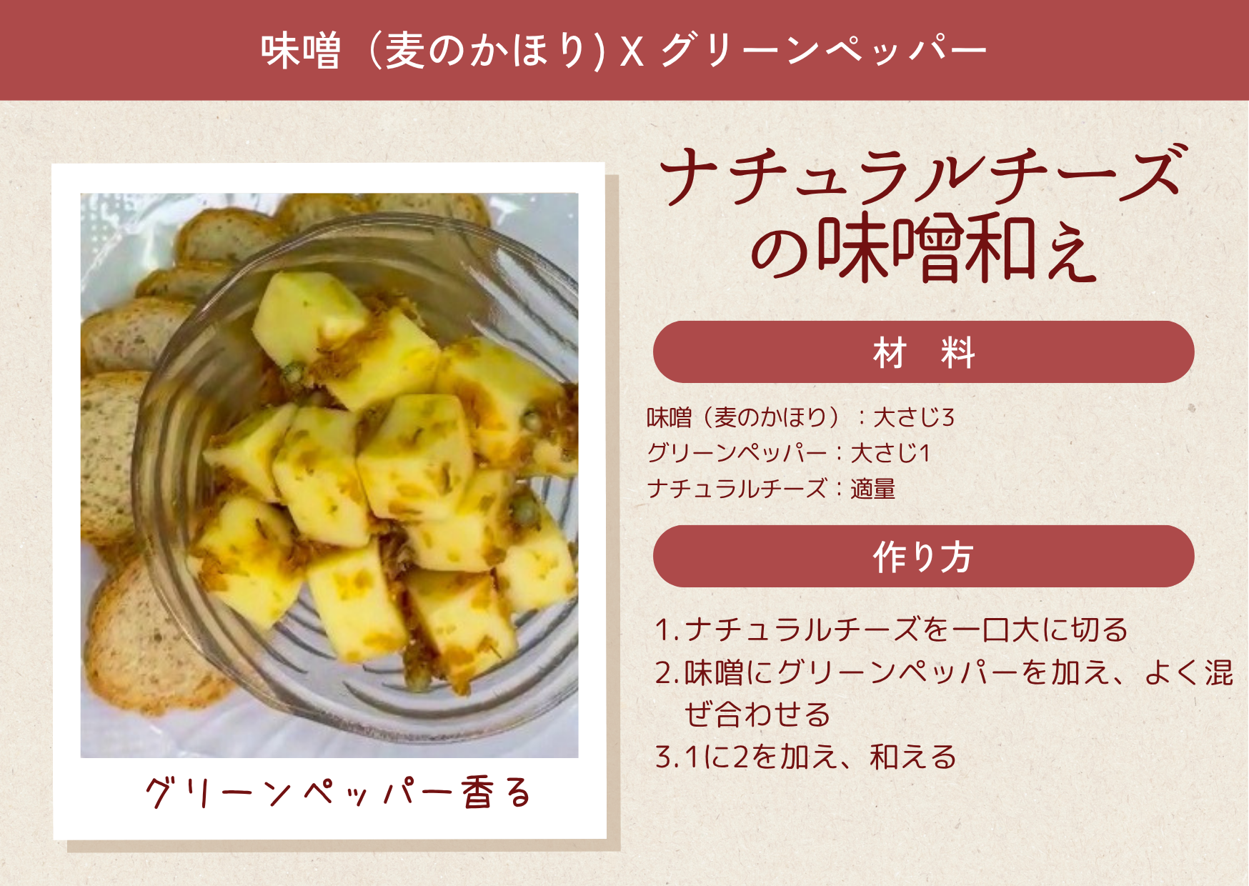 麦みその甘みに、グリーンペッパーの爽やかなアクセントが入り、ナチュラルチーズにつけてマイルドに!香り豊かな白ワインにおすすめ。