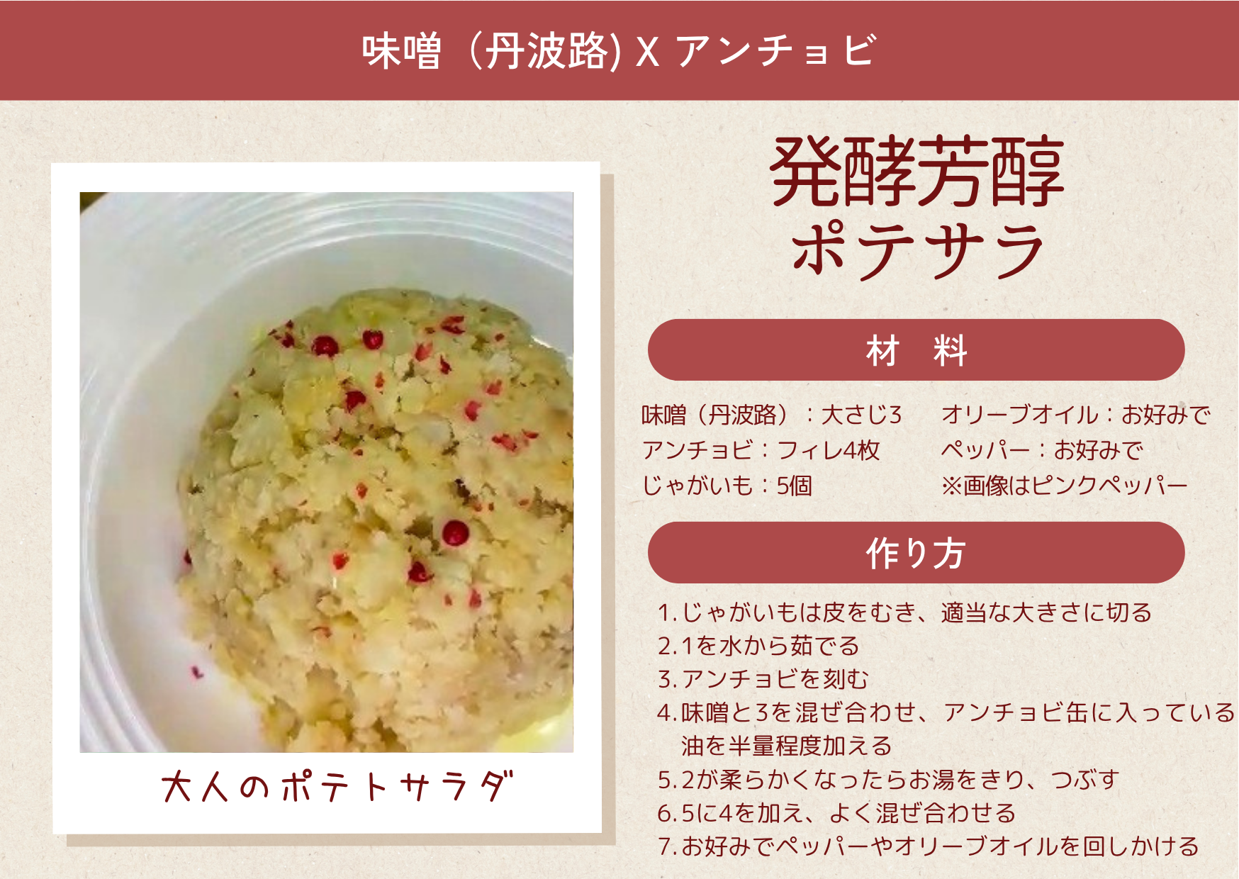 熱々のじゃがいもに、和の発酵調味料「味噌」と、イタリアの発酵調味料の「アンチョビ」を混ぜ合わせれば、発酵芳醇ポテサラに。辛口の白ワインにおすすめ。