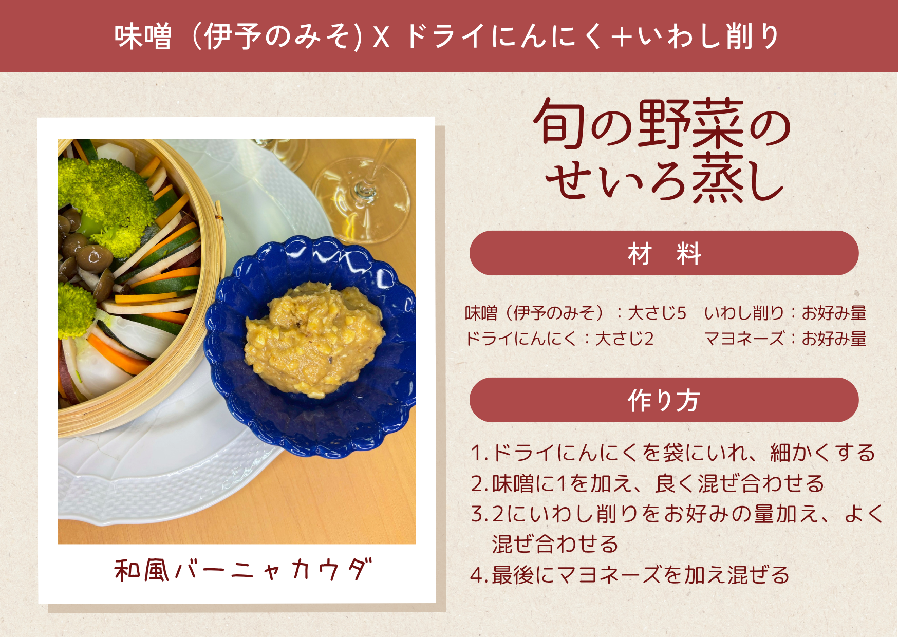 極甘の伊予みそを、にんにくでアクセントを効かせ、いわし削りの旨味をトッピング。旬の野菜の凝縮した旨味をより引き立てる和風ディップとして。