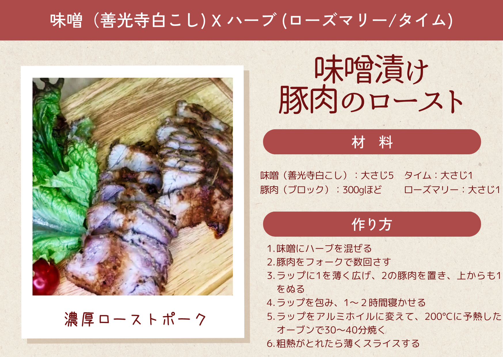 芳醇な香りの善光寺白こし味噌に、清々しいハーブを加えて、ポークソテーにすれば、ライトボディの赤ワインにおすすめの、和洋融合をお楽しみいただけます。