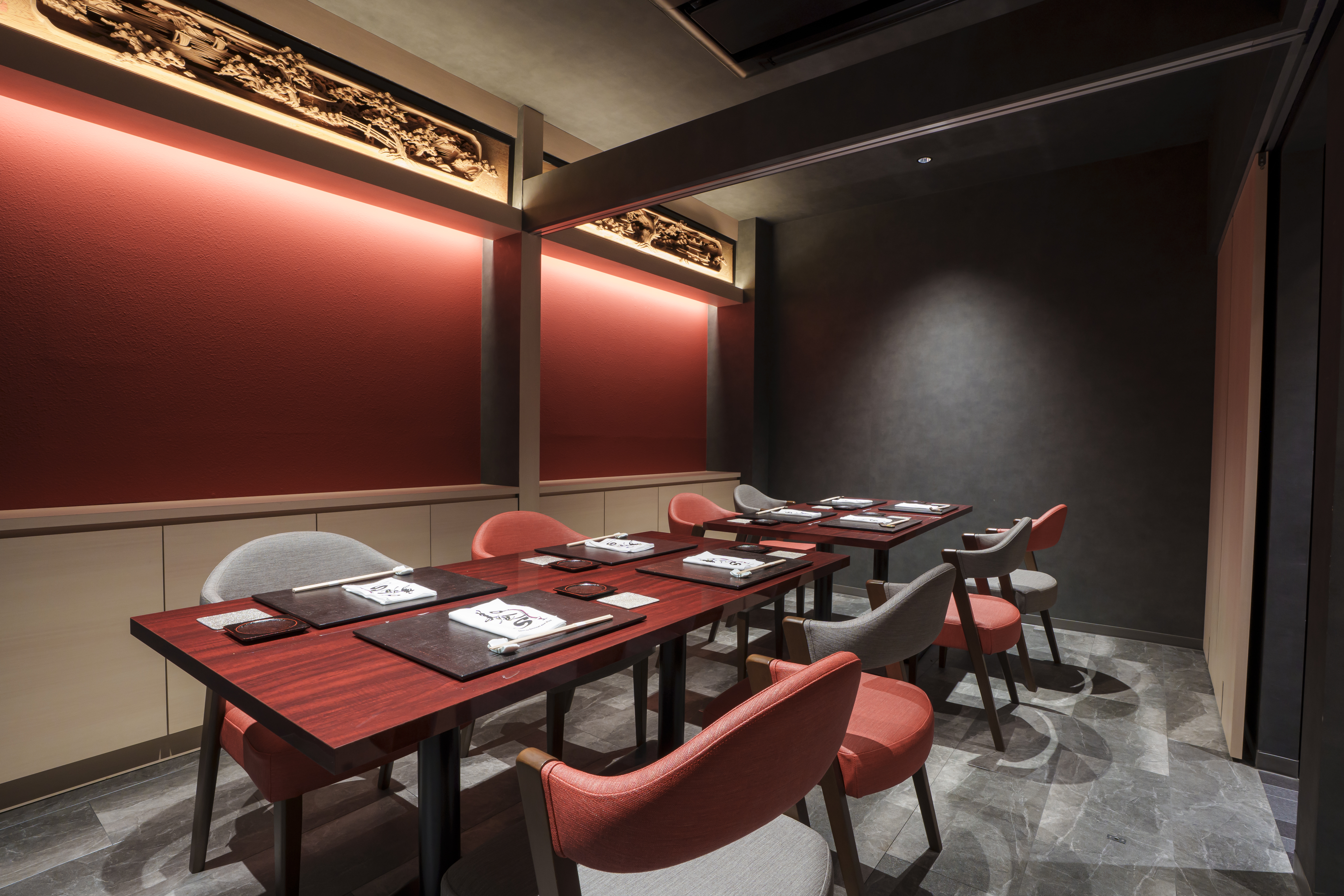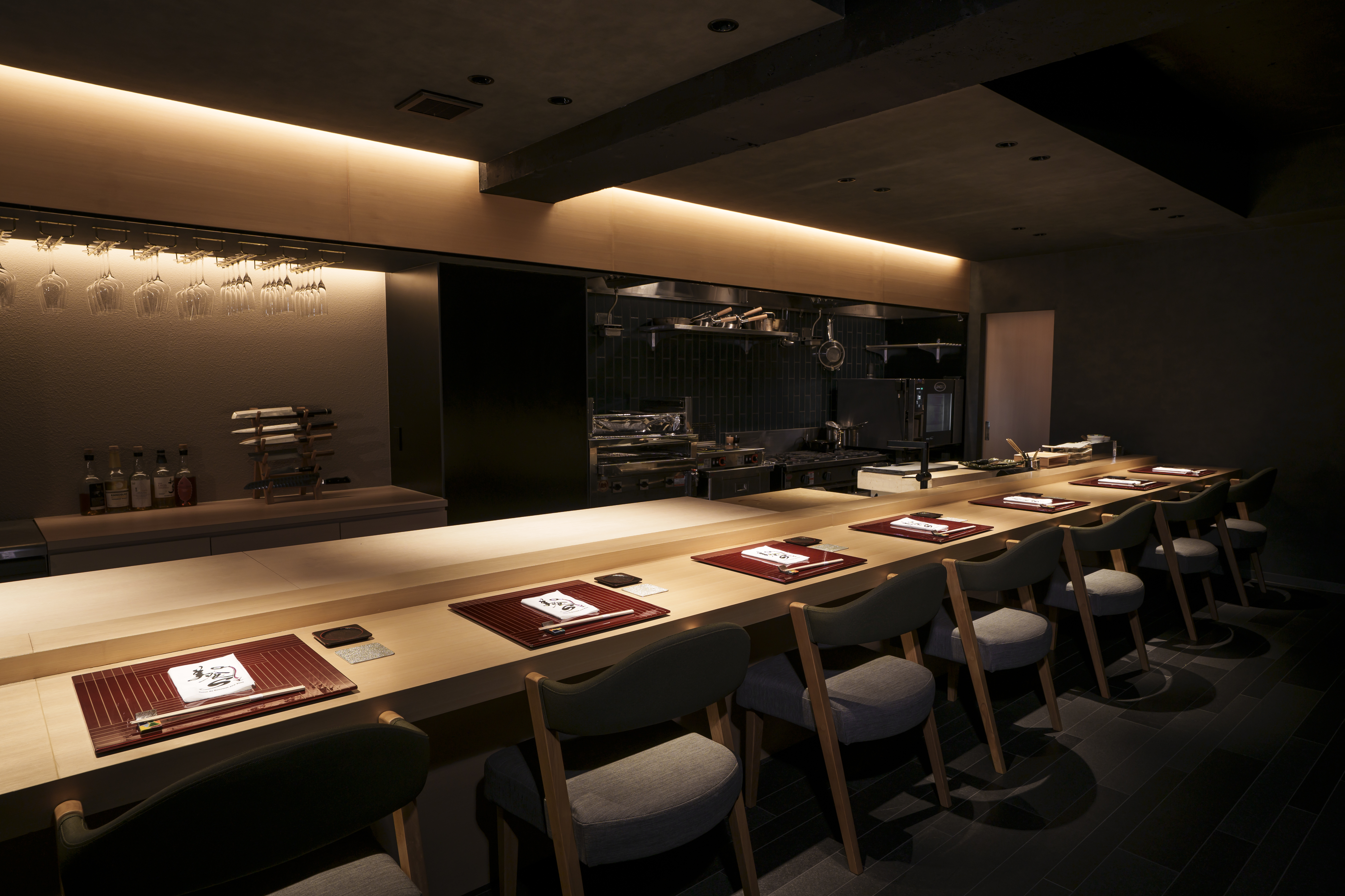 お一人様や少人数でのご利用に最適な臨場感あるカウンター席と、大切な方との語らいを静かに楽しめるテーブル席をご用意しております。