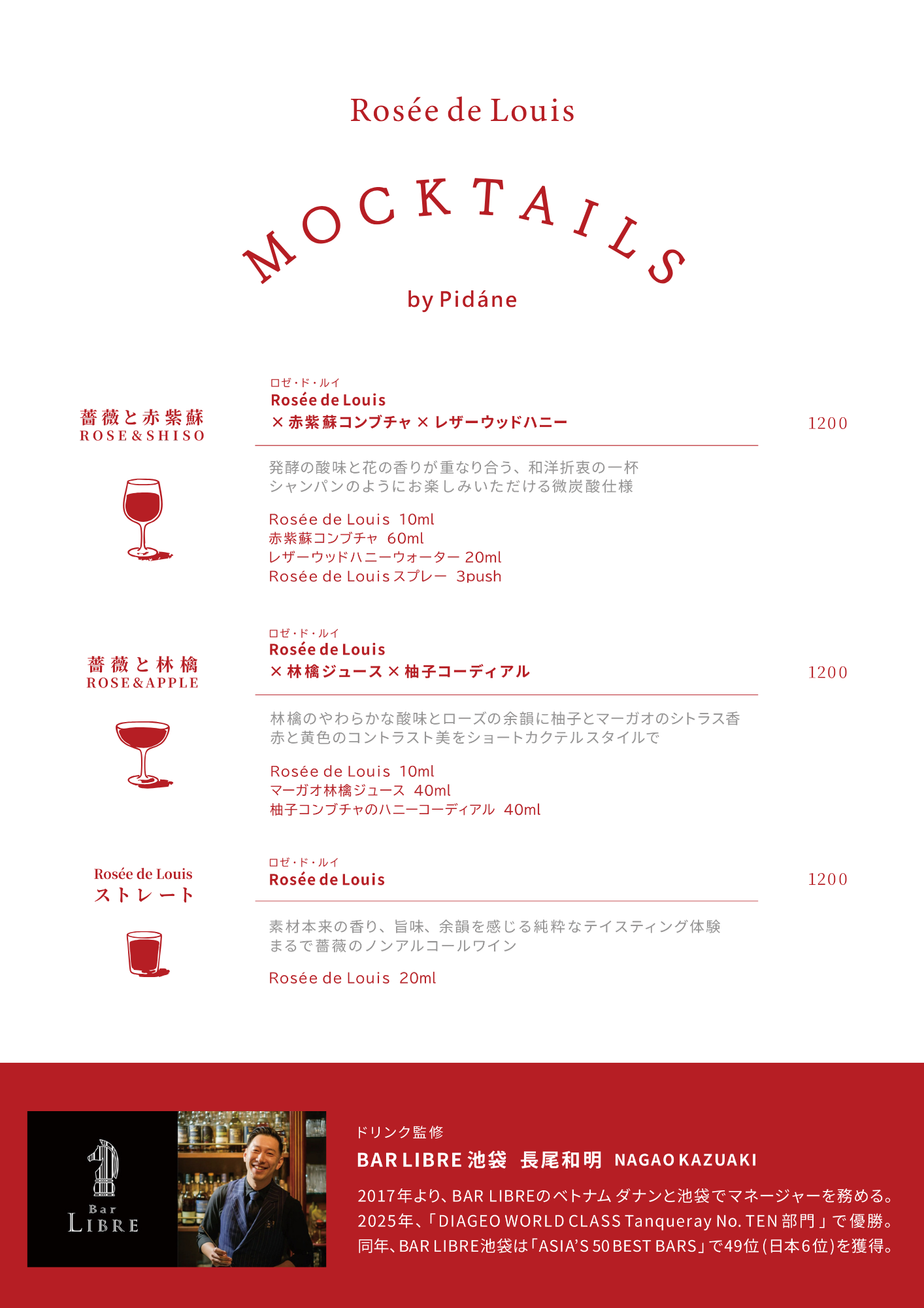 世界大会出場歴を持つバーテンダー・長尾氏が、Rosée de Louis の魅力を引き出すために2種類のMOCKTAILを開発。繊細なローズの香りと発酵由来の奥行きを活かした、ここでしか味わえない贅沢な一杯です。