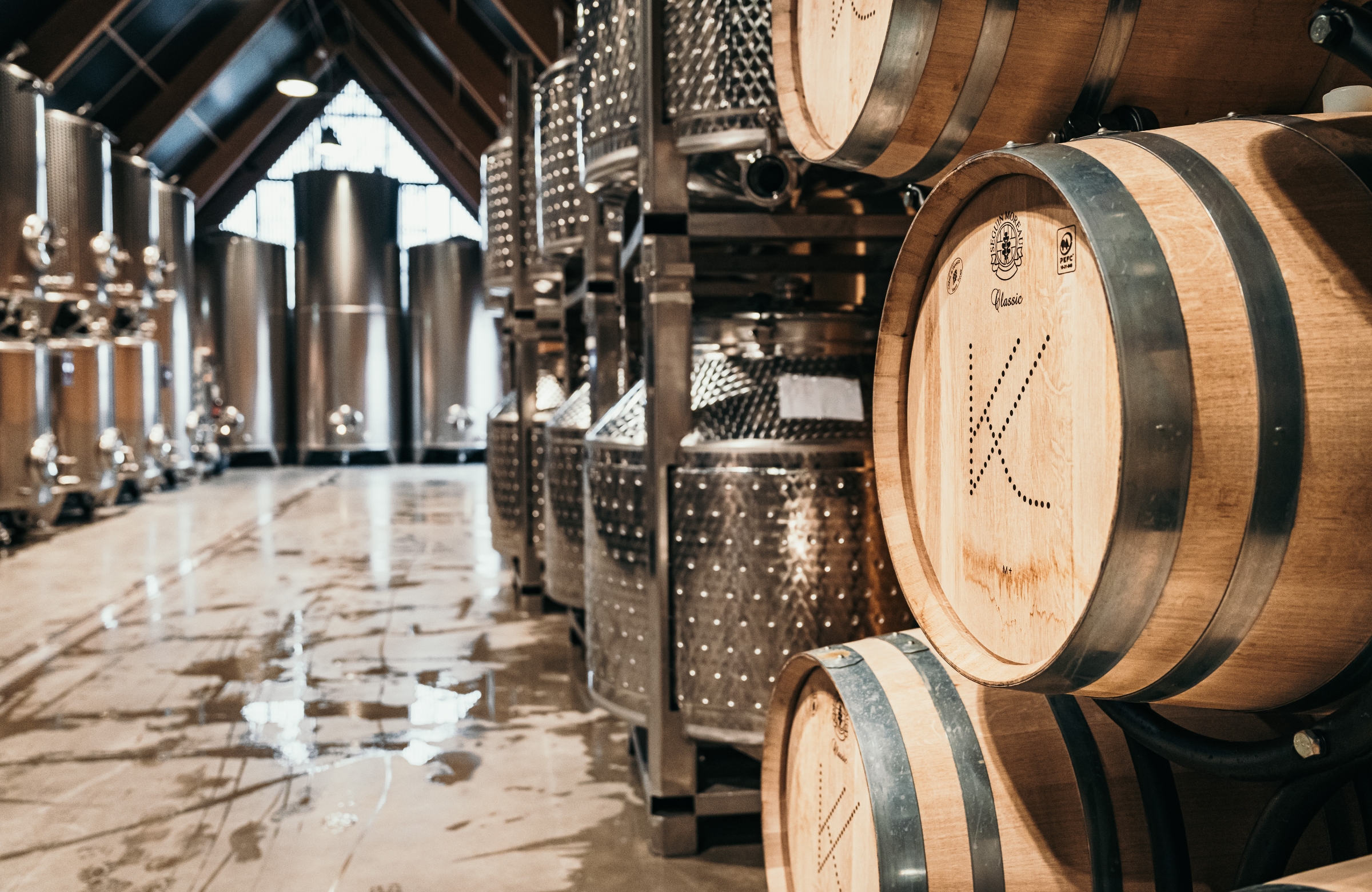 品種ごとにステンレスタンクで発酵後、主にステンレスで熟成しつつ、一部はオーク樽で熟成。