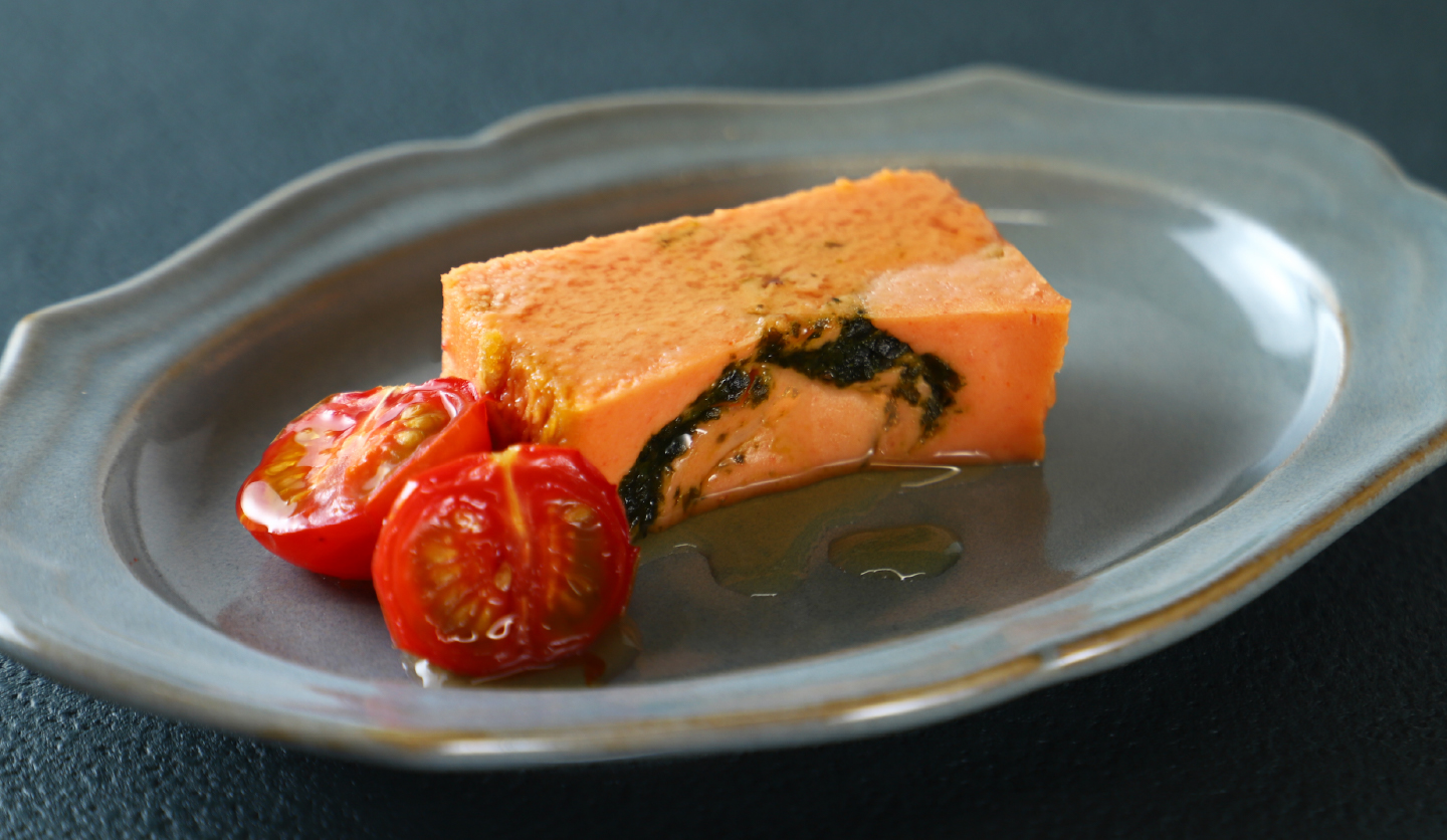 赤い色味は「トマト」のペーストで化学調味料を一切使用せずに表現しました。フルーティで、甘酸っぱくて、まるでフルーツのように濃厚なトマトペーストを使うことで、トマトの魅力を遺憾なく発揮しました。ほんのりプラスした塩味が甘さを引き立てています。