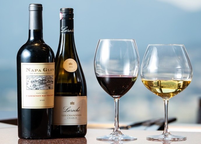 王道のスタイルを表現する代表的な赤ワインをご提供するのは28階の「鉄板焼 なにわ」。アメリカ カリフォルニア州「ナパ・グレン カベルネ・ソーヴィニョン ナパ・ヴァレー」は、ベリーの豊かな果実味やスパイス感、そしてカベルネ・ソーヴィニョンらしい力強さが特徴です。カウンターの目の前で焼き上げるお肉のあふれる旨味は、赤ワインに含まれるタンニンを和らげ、口当たりをまろやかにする抜群の相性です。