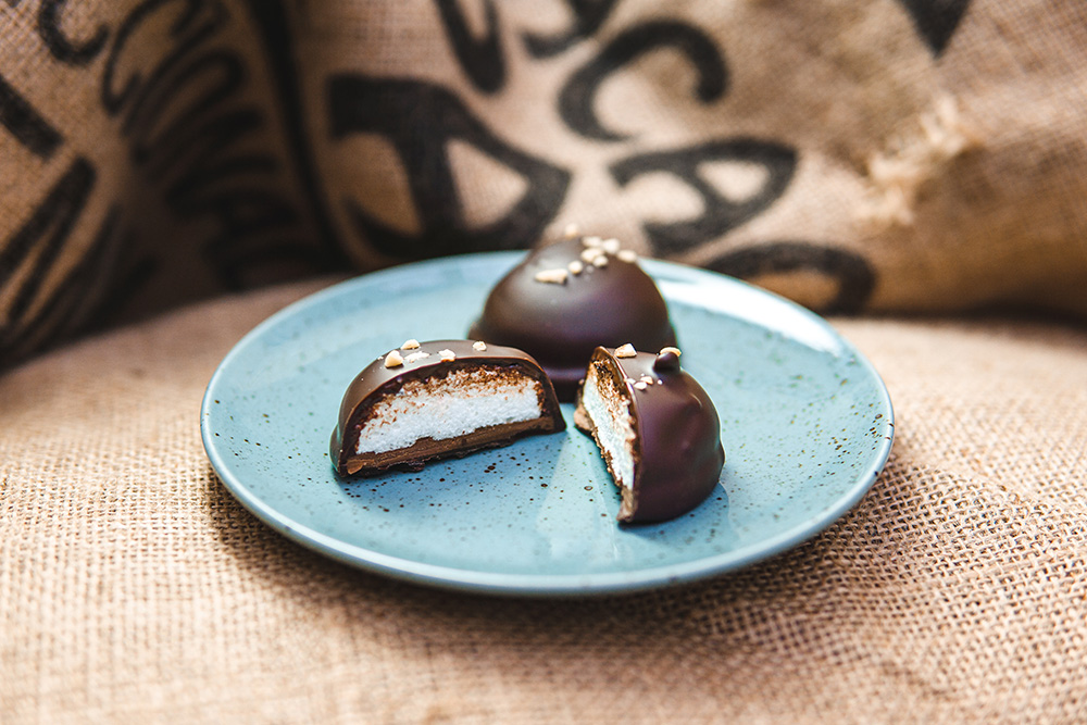 プラリネやジャンドゥーヤをベースにマダガスカル産バニラが香るギモーヴのムースを載せてダークショコラでコーティングしました。泡のように柔らかく、繊細で優しい甘さと香りが広がります。