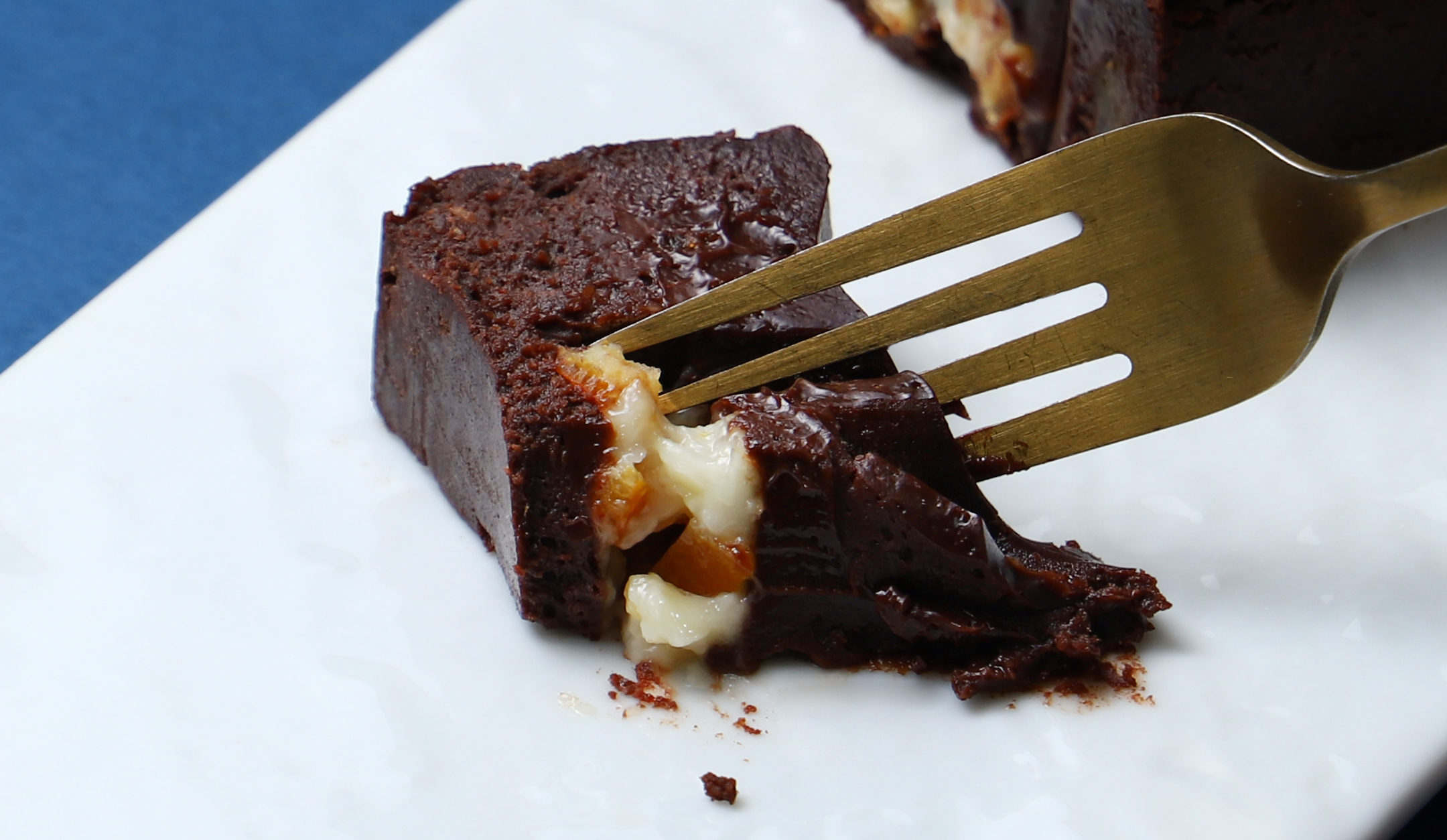 ガトーショコラを食べ進めると、たっぷりのクリームチーズが現れます。クリームチーズは生地に混ぜ込むのではなく、あえて「塊」のまま閉じ込めました。カットした瞬間に現れる白と黒のコントラストは圧巻です。食べた瞬間、濃厚チーズの旨みとコクがダイレクトに訪れます。