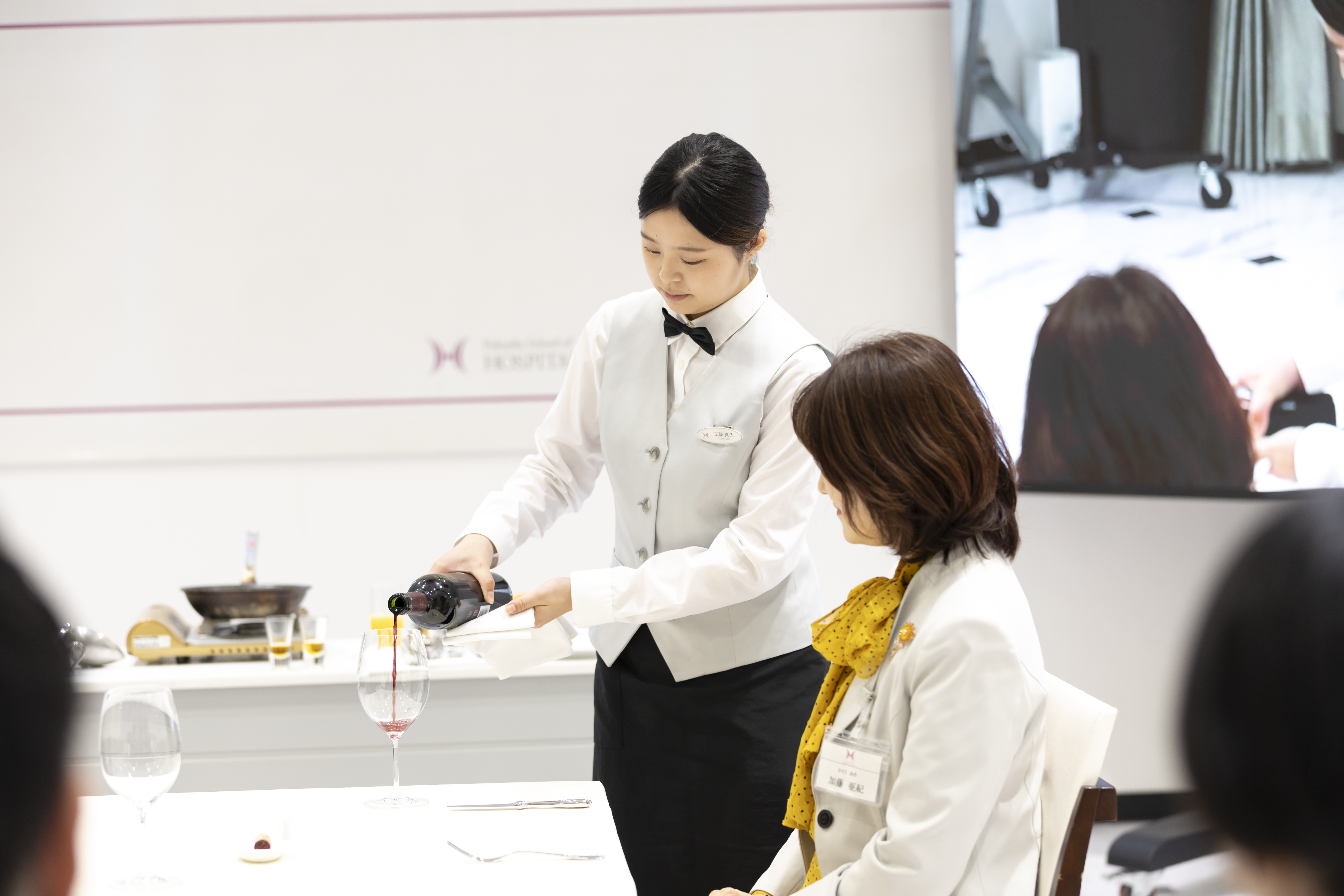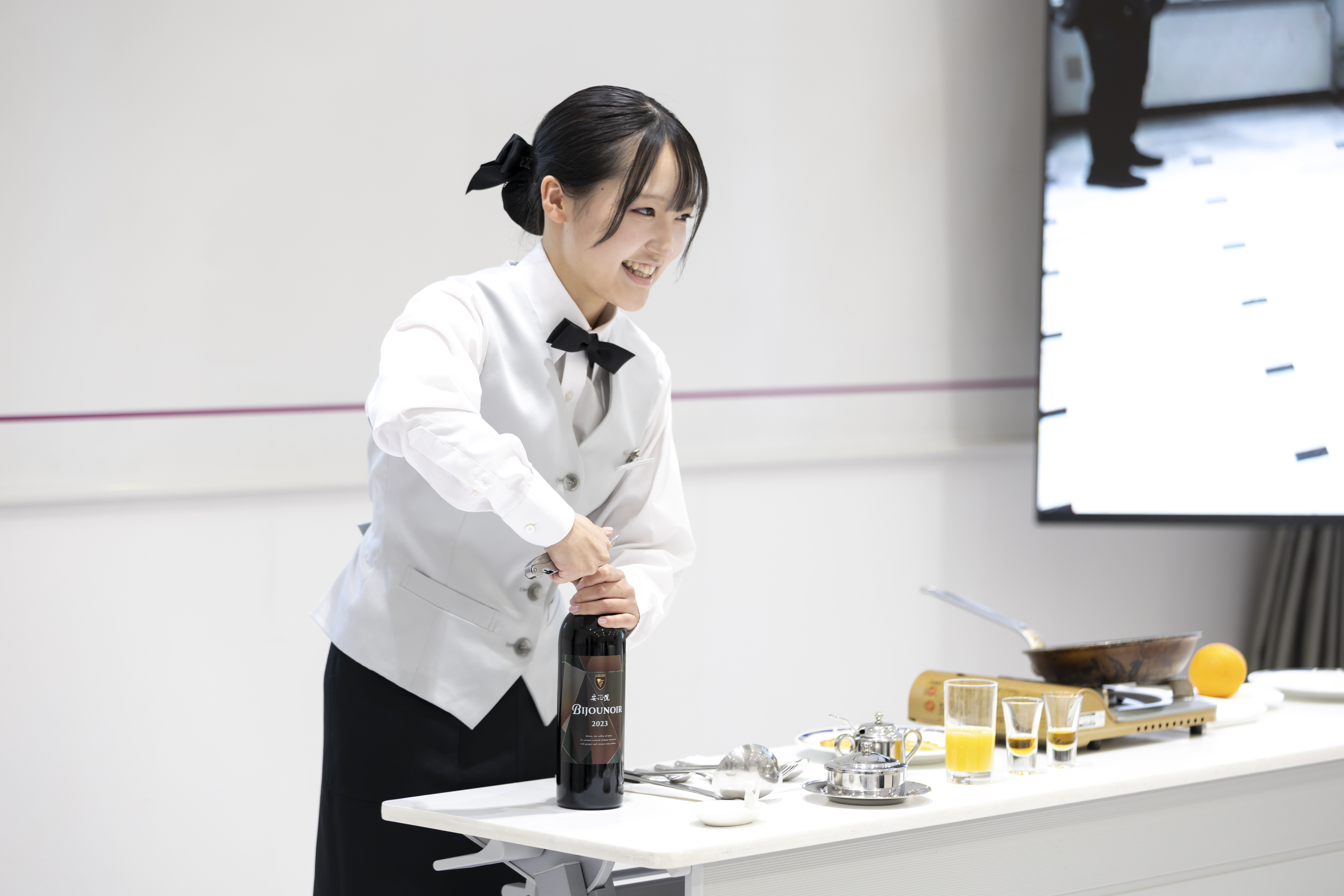 会場には張り詰めた緊張感が漂い、学生たちは震える手を押さえながらも、練習の成果を存分に発揮。プロの審査員を前に、笑顔を絶やさず優雅なサービスを披露しました。