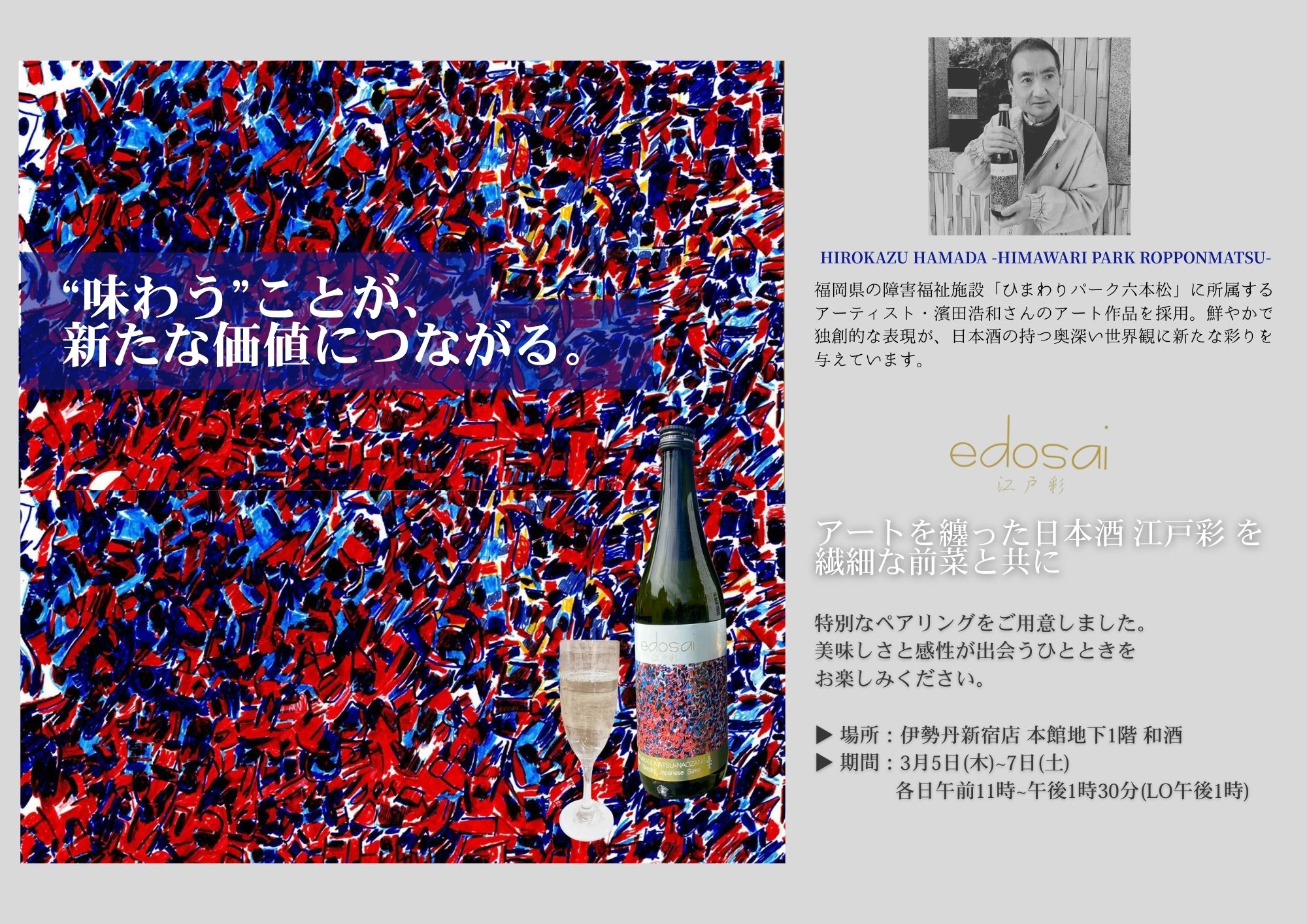 伊勢丹新宿店 本館地下1階 和酒のイセタンクラフトビアバーにて、障害のあるアーティストの作品をラベルデザインに採用した日本酒「江戸彩(edosai)」を、期間限定で提供いたします。