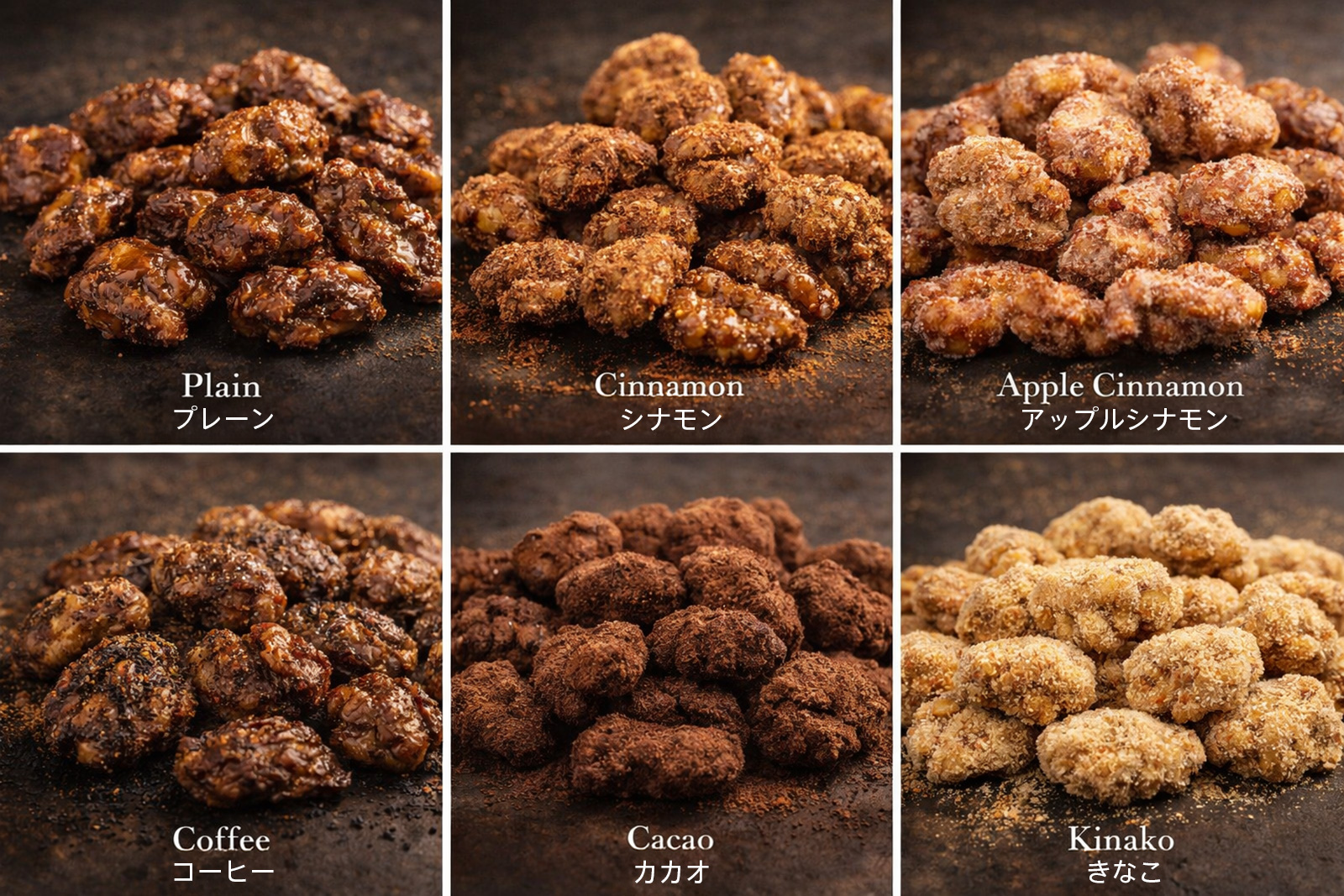 今回のMakuakeプロジェクトでは、キャラメルキャンディとクルミのキャラメルコートを、それぞれ6種類ずつご用意しました。