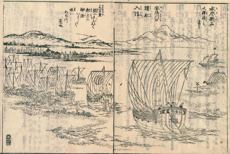 江戸時代、上方(大坂や西宮、今津等)から江戸まで、上方産の清酒が海路・樽廻船などで運ばれ、江戸へ下るお酒ということで「下り酒」と呼ばれ、品質が高いことから評判を呼び「下り酒」が江戸で大層もてはやされました。(以下画像/出典:『攝津名所圖會』安治川口諸船入津より)