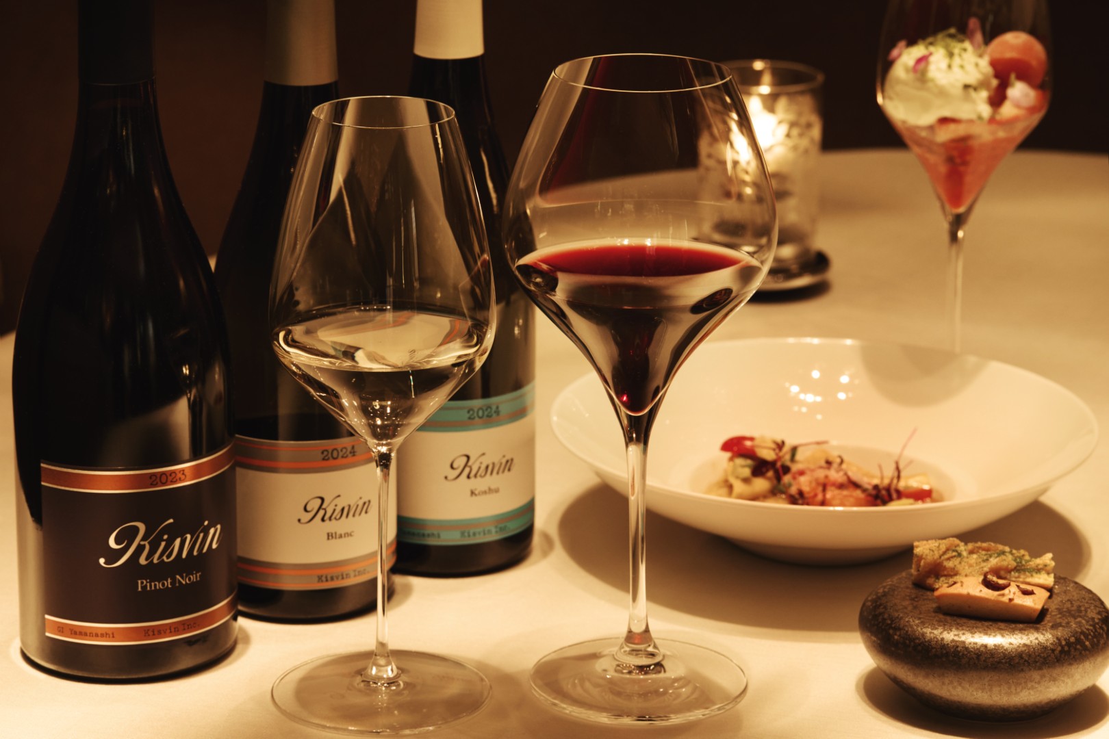 都会の喧騒から離れた落ち着いた大人の空間で、山梨のテロワールを映すキスヴィン ワイナリーの美しいワインと、シェフの感性から生まれる一皿が出会う特別な夜を、どうぞご堪能ください。