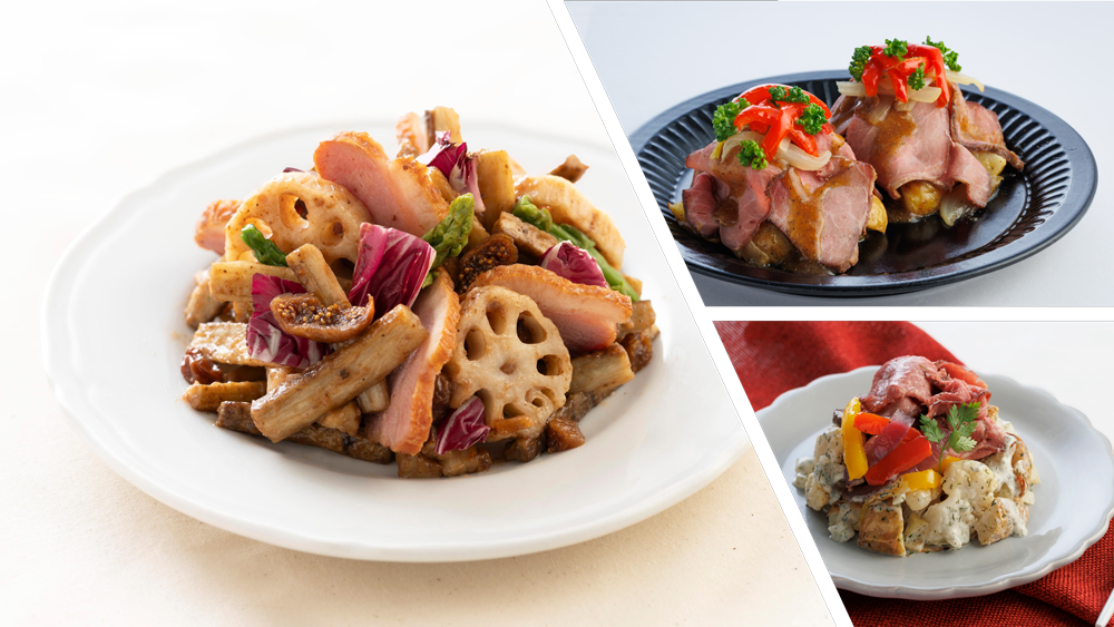 大きめにカットして焼いたごぼうとれんこんに、バルサミコビネガーとオリーブが薫るドレッシングを合わせました。ごぼう特有の土の香りに似た風味と、ケンコーマヨネーズの『オリーブ&バルサミコビネガードレッシング』の酸味と深みのある風味がよく合い、奥行きのある味わいを生み出します。ドライいちじくの甘味がアクセントになっています。しっとり柔らかな合鴨ローストと、ごろごろとした根菜の食感も楽しい一品は、ワインのお供としてもぴったりです。