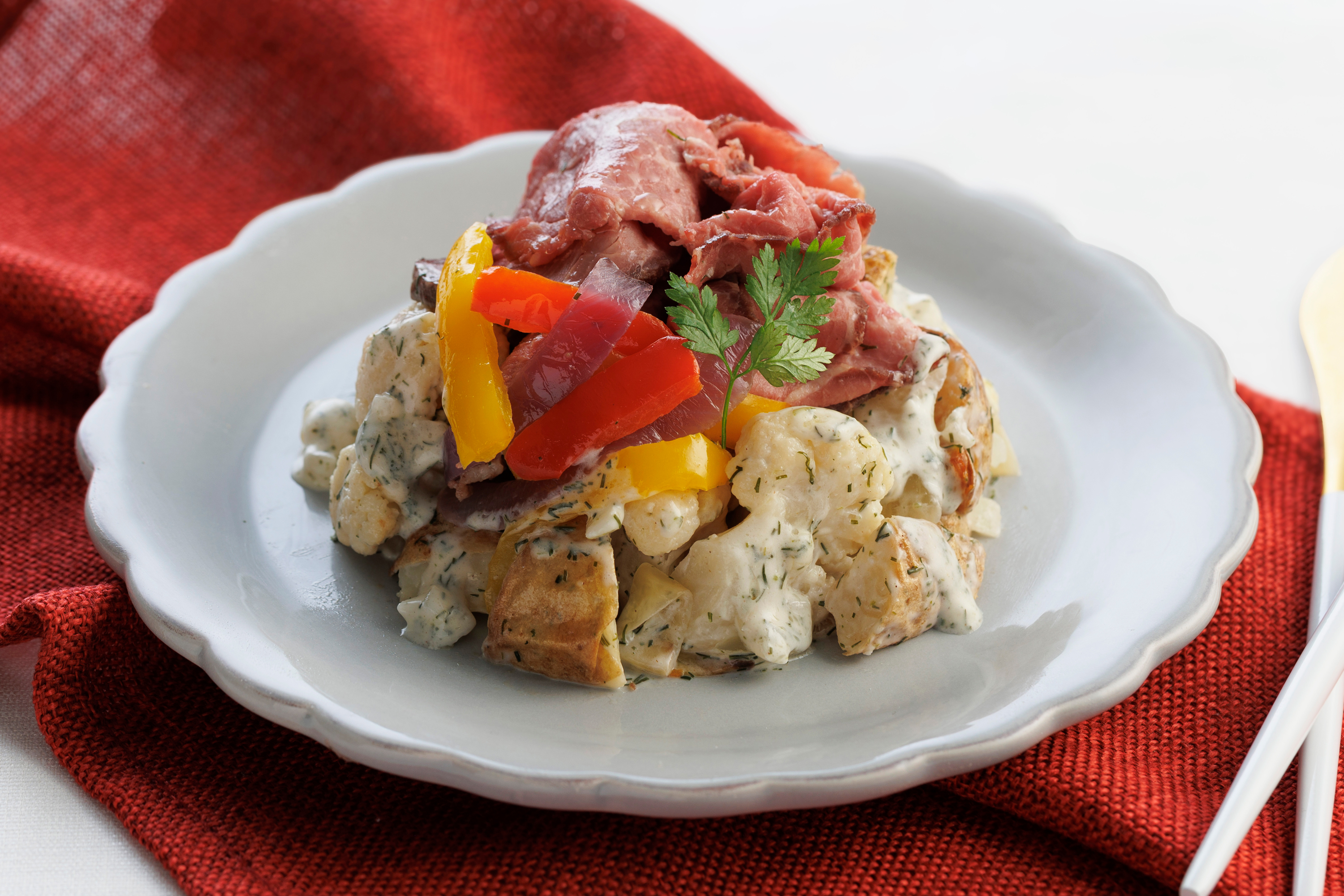 炭火焼ローストビーフと焼き野菜を、ディルが香るクリーミーなソースで和えた、華やかなパプリカが特長のデリ風サラダです。