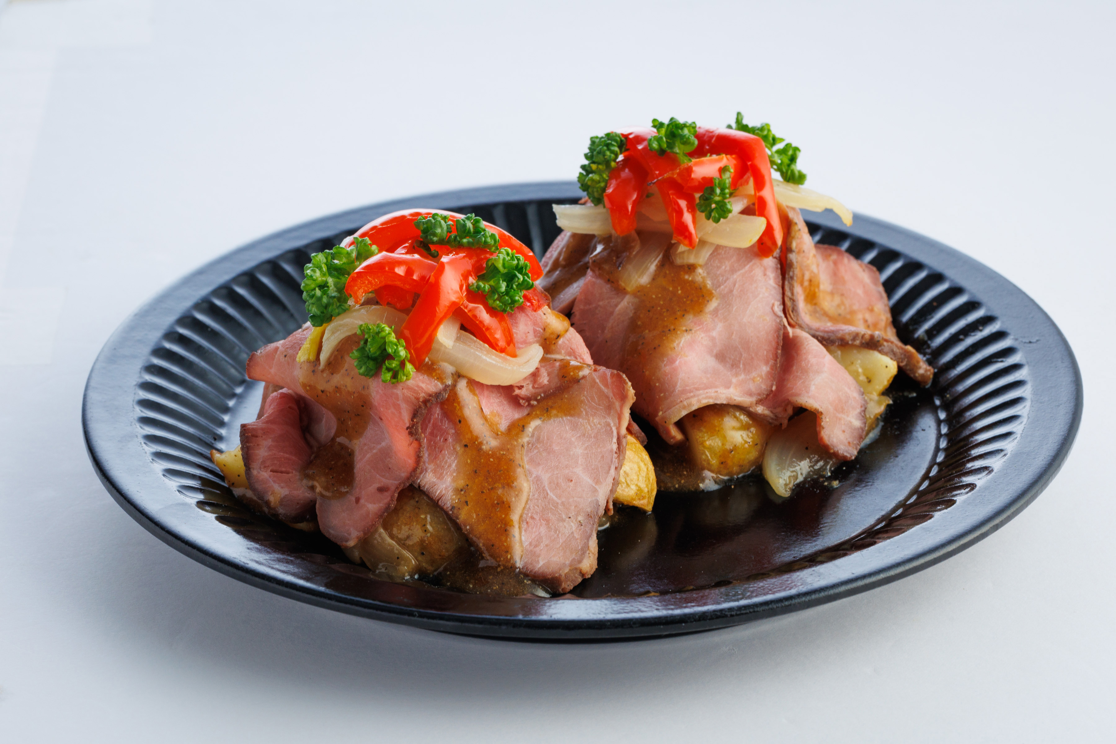 直火で香ばしく仕上げたローストビーフに、グリルしたじゃがいも、たまねぎ、パプリカを合わせ、醤油ベースの和風ソースで仕上げた和風テイストの一品です。