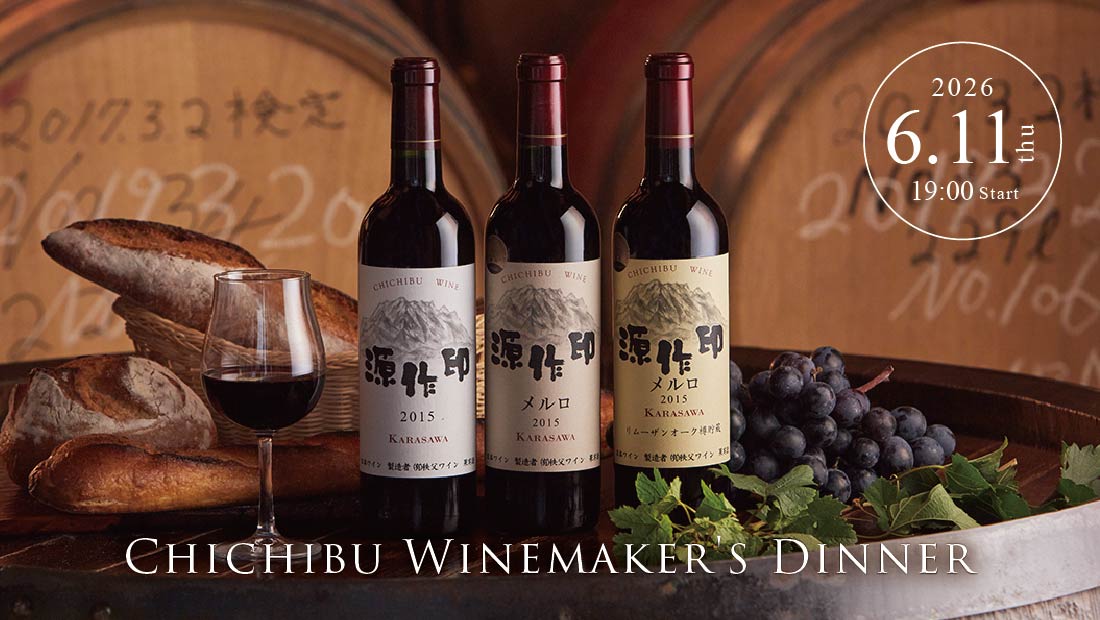 1940年創業の埼玉県初の老舗ワイナリー「秩父ワイン」の村田道子氏をお招きし、代表銘柄『源作印』や日本百名山のひとつ両神山麓の自社畑で栽培した『KARASAWA』などワインに込められた想いを聞きながらワインと特別料理のペアリングを愉しむ食事イベントとなっております。