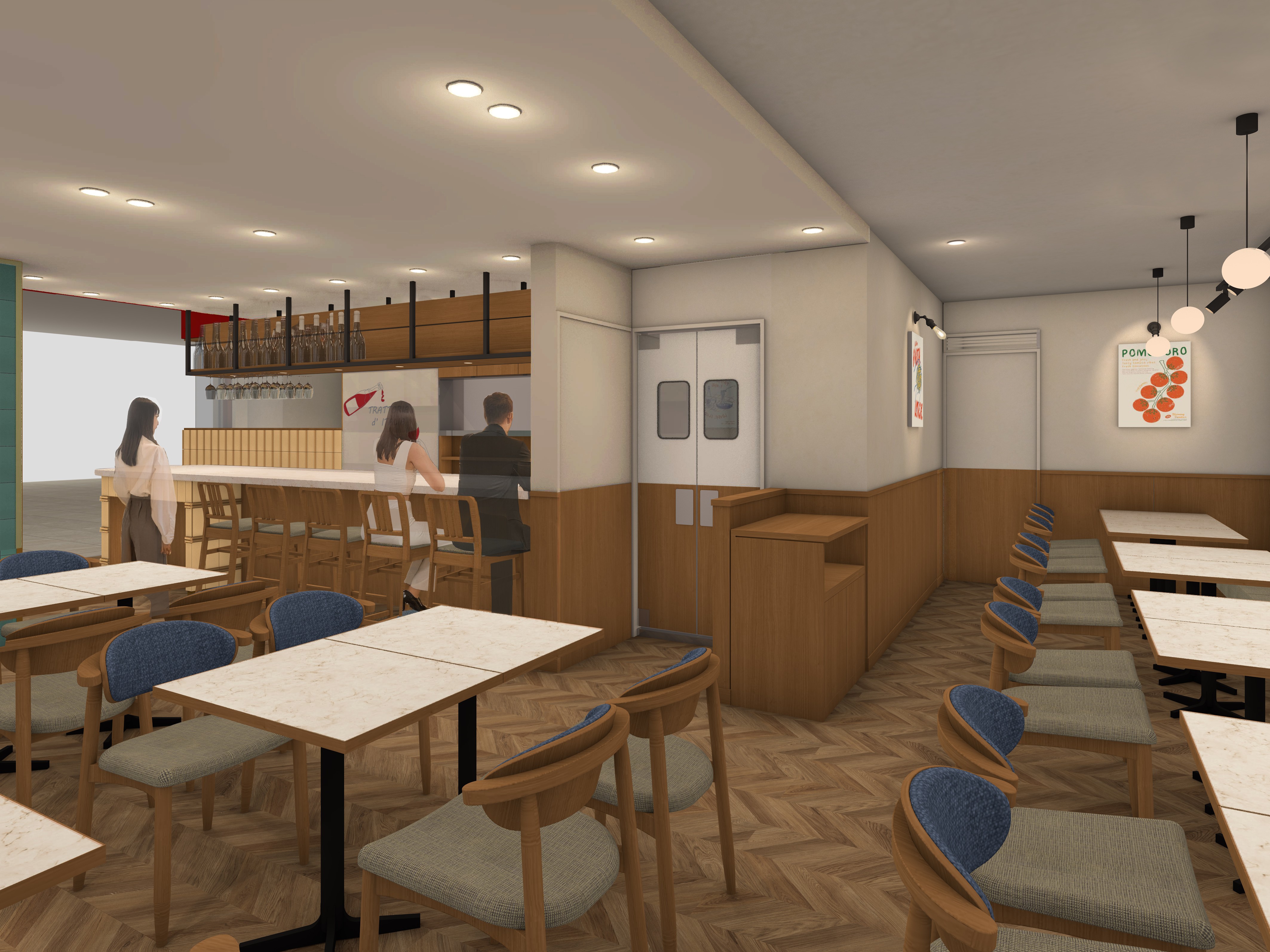 IT関連企業の集積を目指す拠点として誕生した「IT tower TOKYO」、そして多様なカルチャーと人が交差し、再開発が進む池袋駅西口エリア。その特性に合わせ、アルコール需要にも対応したメニュー構成としました。ダイニングテーブルでのしっかりとしたお食事需要にくわえ、お仕事帰りの気軽な一杯にも応える、対面型のカウンターバーや、スタンディングでも楽しめるハイテーブルを設けています。ランチタイムは食堂のようなエネルギッシュなパワー、ディナータイムはワインを片手に会話が弾む賑わいと、昼夜異なる表情でトラットリアの活気を感じられる、そんな店づくりとしています。