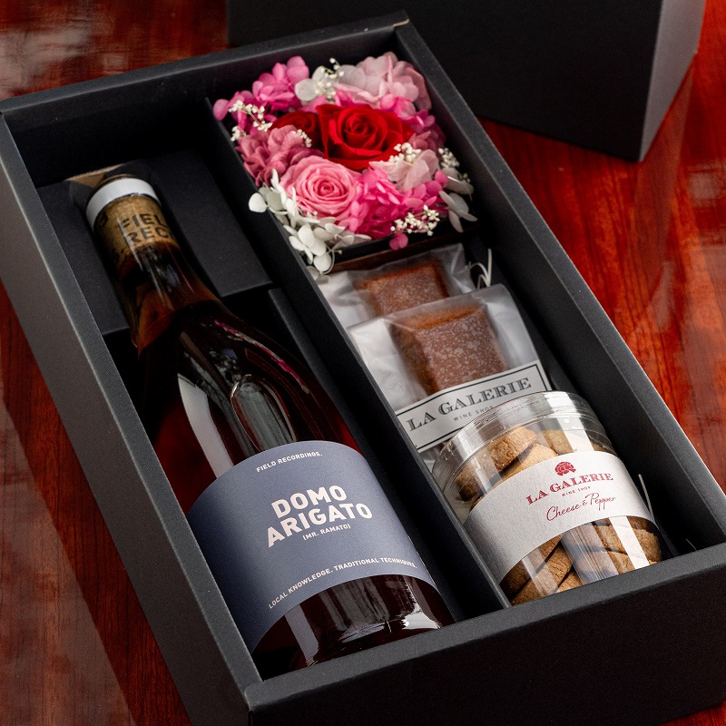 ワインは、赤・辛口白・セミスウィート・オレンジの4種類からお好みの1本をお選びいただけます。味わいはもちろん、ラベルデザインから選ぶ楽しみもあり、贈る相手のイメージに合わせた一本をお選びいただけます。フラワーボックスは、インテリアとしても長くお楽しみいただける仕様で、華やかさと実用性を兼ね備えた贈り物です。日常に彩りを添えながら、感謝の気持ちを美しく伝えます。