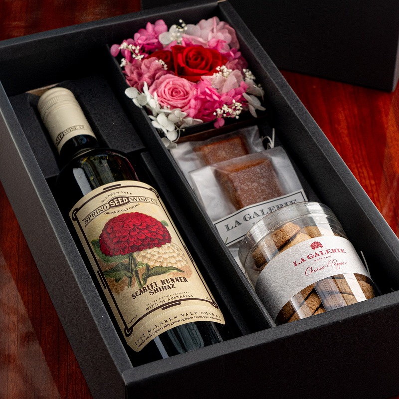 贈った後も長く楽しめるフラワーボックス、赤・白・オレンジ・セミスウィートの4種から選べるワインとこだわりの焼き菓子で彩る上質なギフトセット。5月8日発送、数量限定で予約受付中!