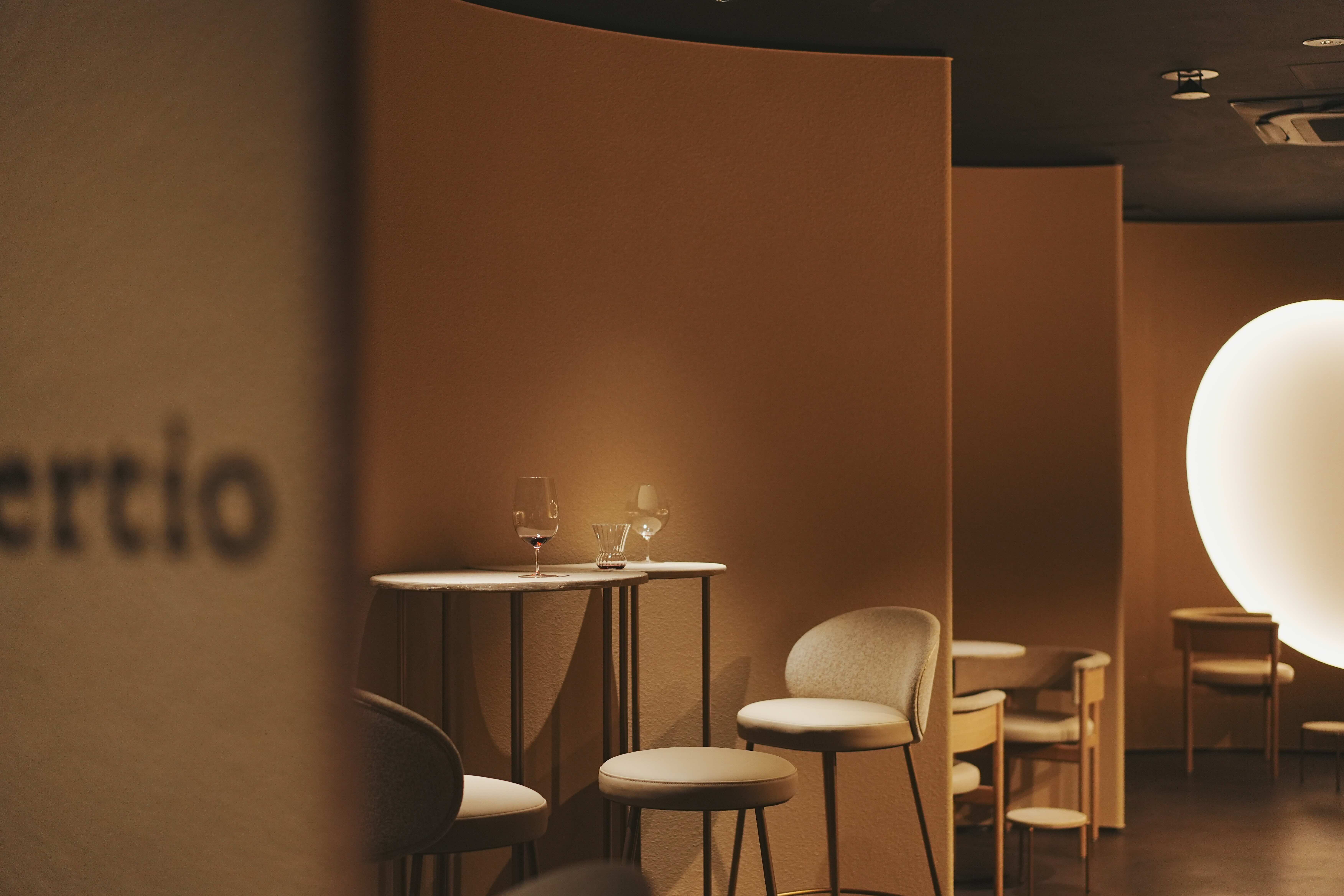 緩やかな曲線と楕円の重なりで構成されたこの空間は、コンパクトでありながら、心地よい没入感を生み出しています。シェアリングテーブル、カウンター、ラウンジ、個室——それらは明確に仕切られているわけではありません。灯りの灯し方、テーブルと椅子の形や配置、波打つように閉じているけれど開かれているような境界が、隣のエリアを気にさせることなく、それぞれの時間への集中を自然に生み出しています。