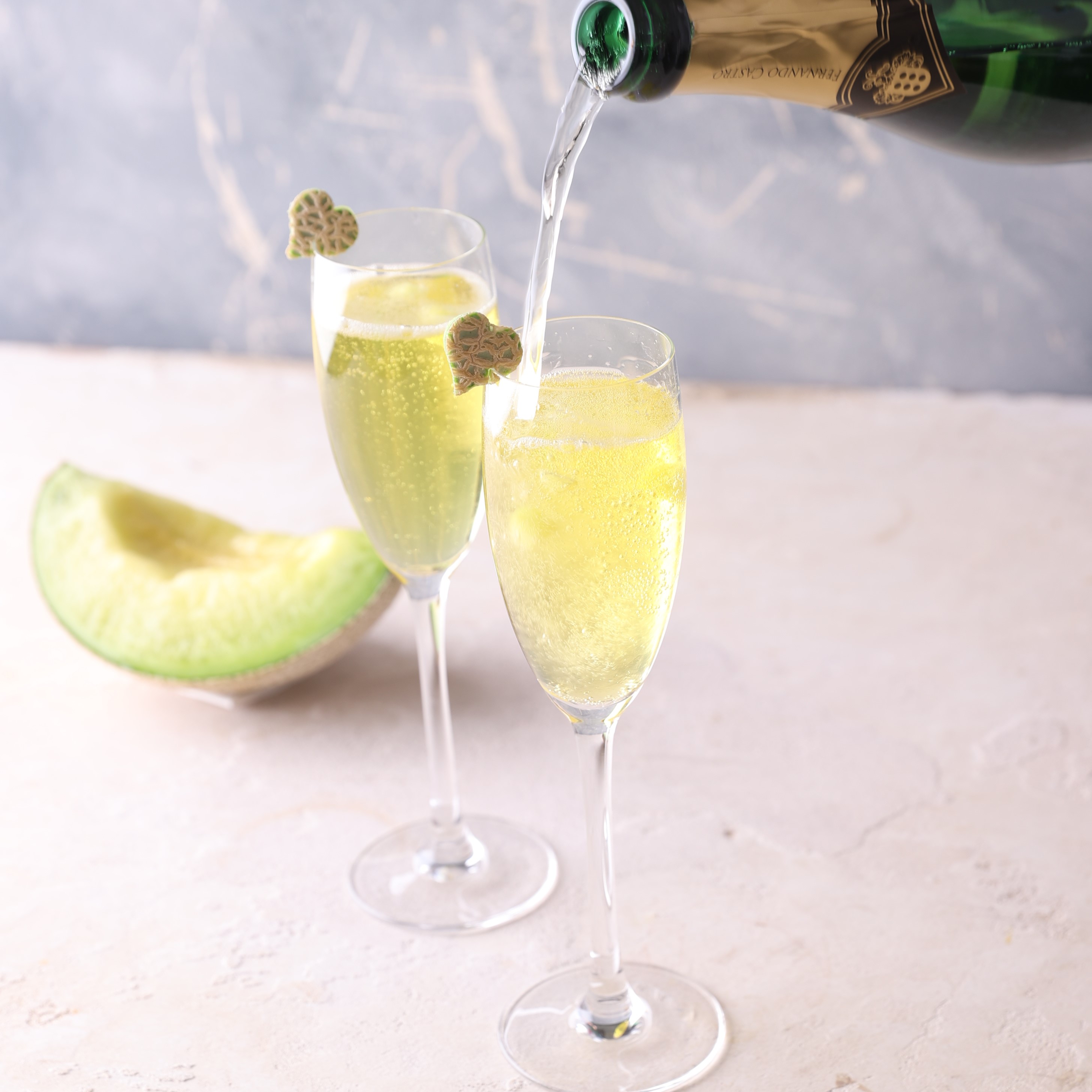 マスクメロンの果汁を搾り、辛口のスパークリングワインを注いでさっぱりと仕上げました。