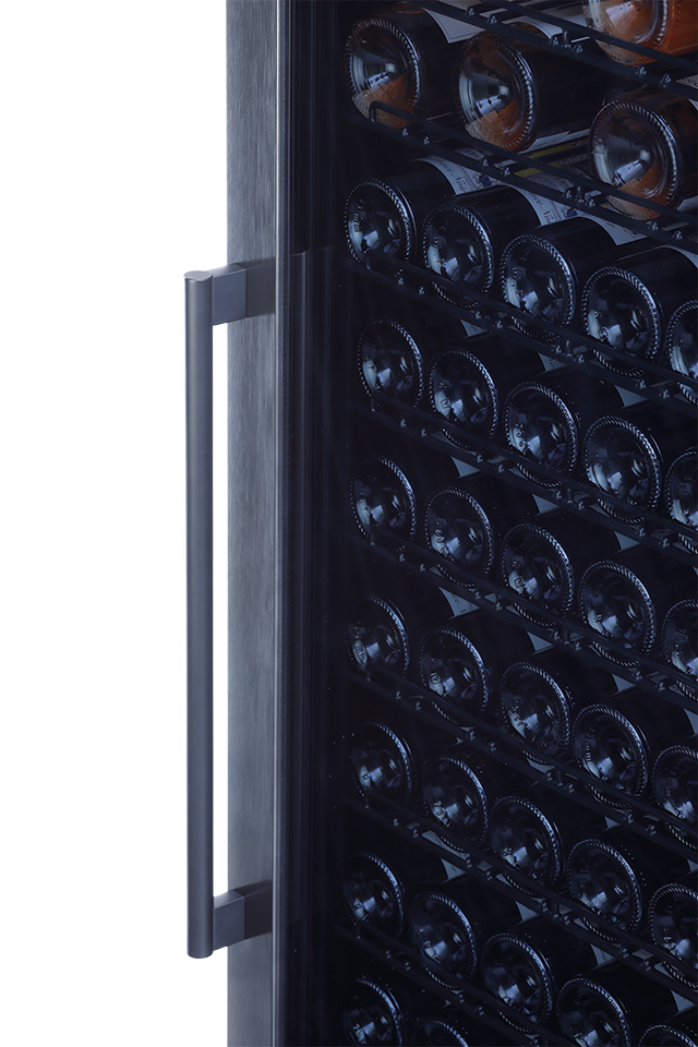 約100本とまとまった本数のワインを1台で管理できるため、提供用ワインのストック保管に適しています。さらに、下段のラックを外してボトルを立てて収納することで、抜栓後のワインを保管しながら、デイリーに提供するワインの管理まで一括で行えます。店舗の運用に応じて柔軟な使い方ができ、スペースに制約がありながらも、多くのワインを管理したい店舗に適したワインセラーです。