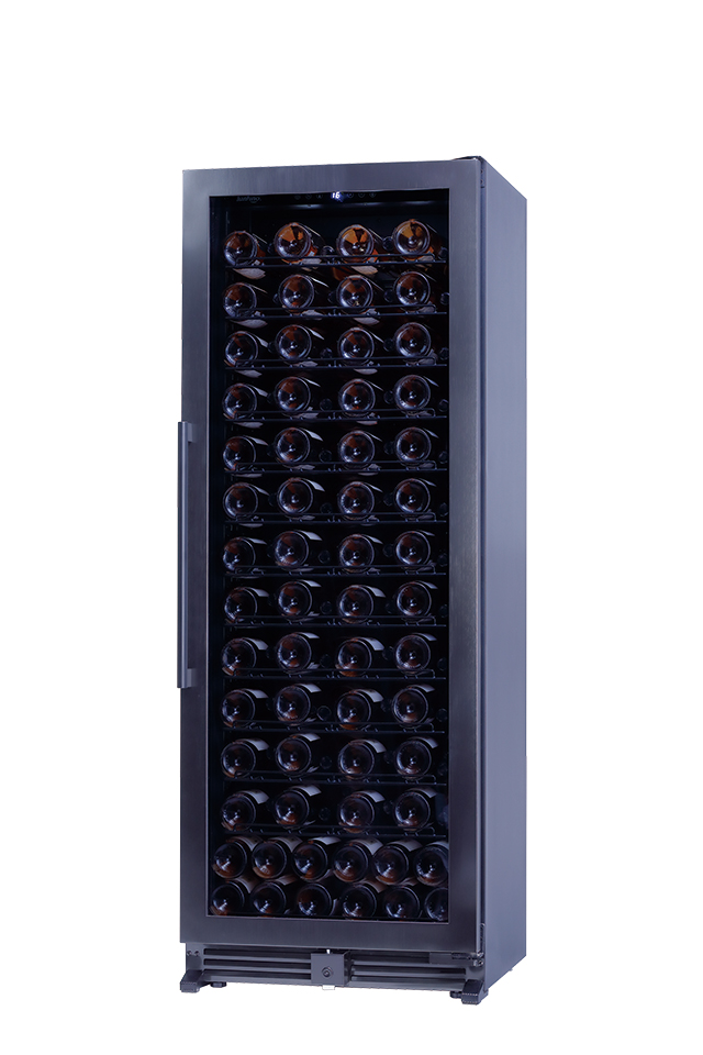 奥行約53cmの薄型設計により、通路やバックヤードなど限られたスペースにも設置しやすい、84~108本収納の1温度帯ワインセラーです。